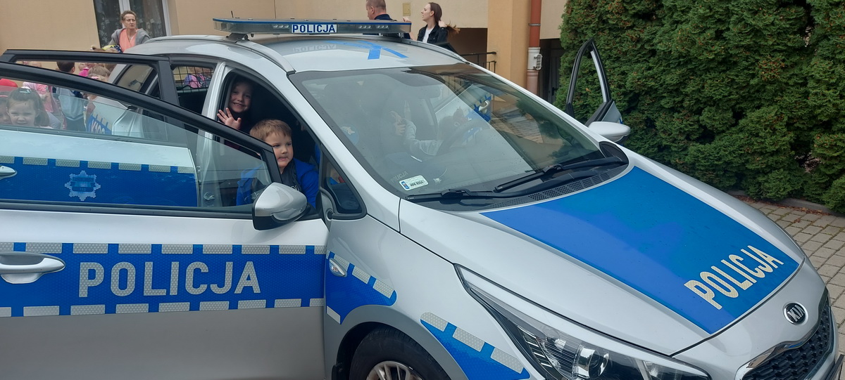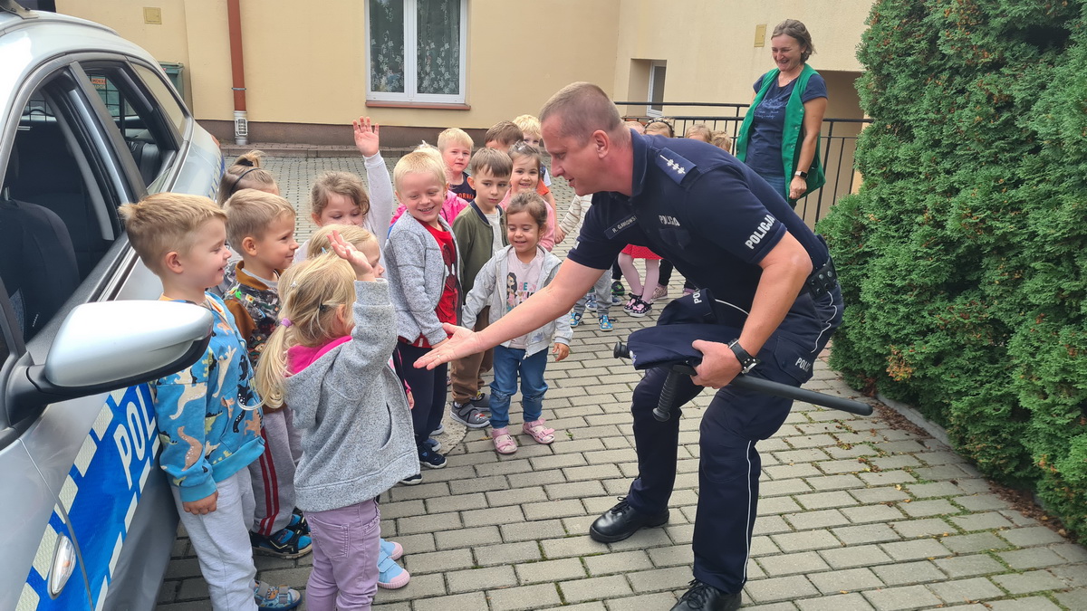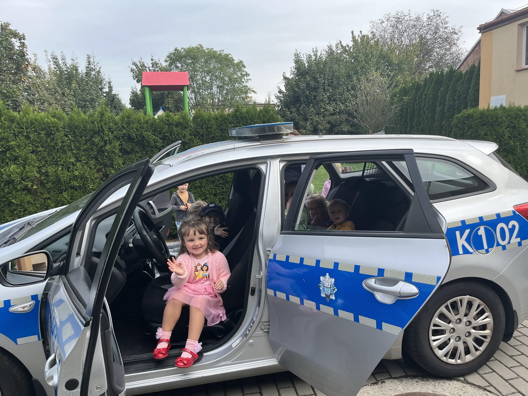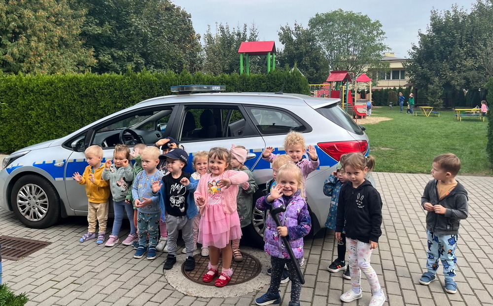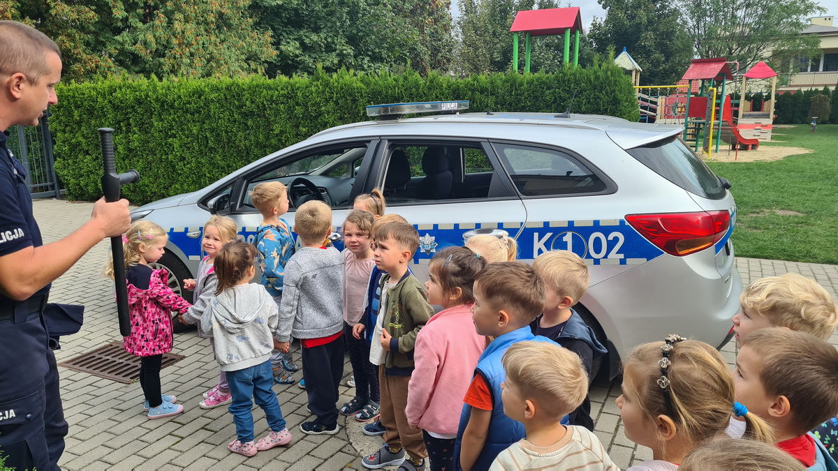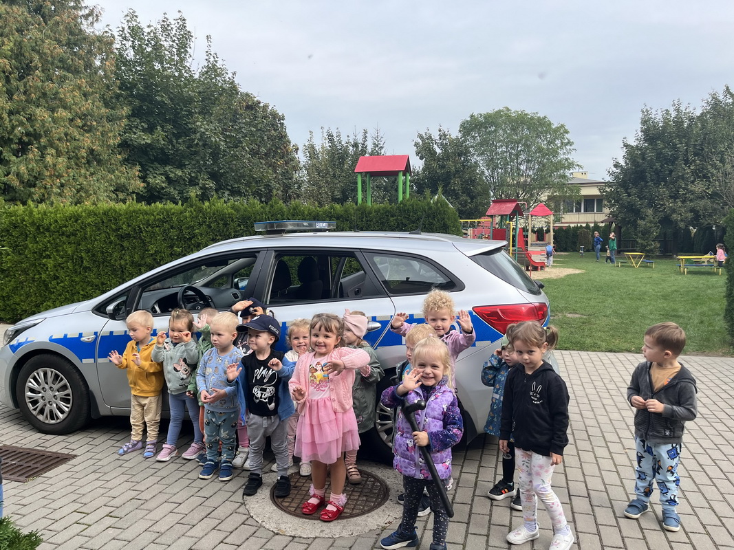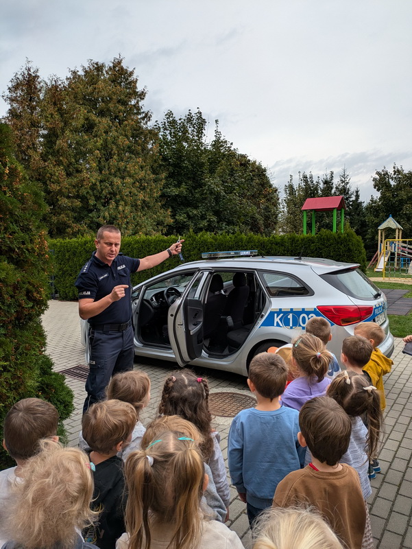 Dziś nasze przedszkole odwiedził wyjątkowy gość – pani policjantka, która przeprowadziła dla dzieci ciekawe i pouczające spotkanie! Podczas wizyty przedszkolaki miały okazję dowiedzieć się, jak ważna jest praca policji oraz poznały zasady bezpieczeństwa, które warto stosować każdego dnia. Nasz gość opowiedział dzieciom o bezpiecznym poruszaniu się po drogach, zasadach przechodzenia przez ulicę oraz o konieczności noszenia odblasków po zmroku. Nie zabrakło też rozmów o tym, jak zachować się w sytuacjach niebezpiecznych oraz kogo poprosić o pomoc, gdy zajdzie taka potrzeba. Największą atrakcją spotkania była możliwość obejrzenia z bliska policyjnego ekwipunku – przedszkolaki z wielką ciekawością przyglądały się policyjnym kajdankom, lizakowi do zatrzymywania pojazdów i radiowozowi, który czekał na podwórku.
