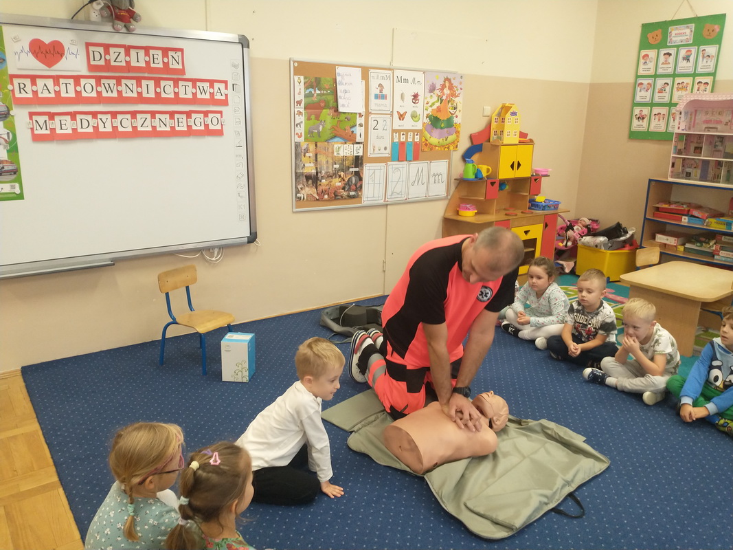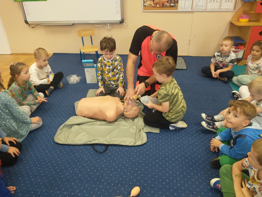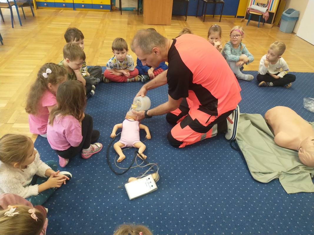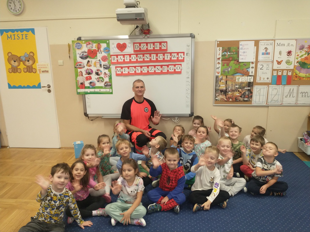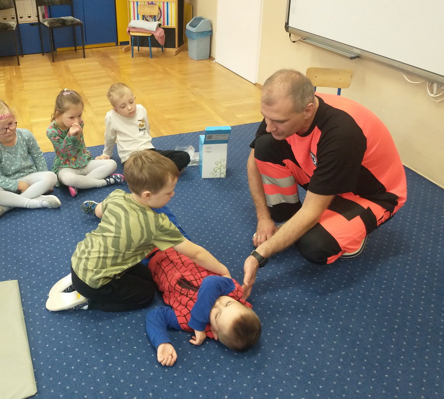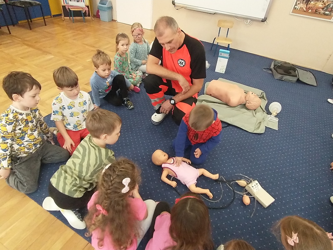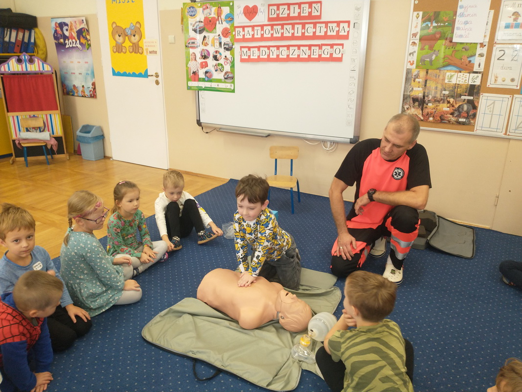 Dzień Ratownictwa Medycznego, obchodzony 13 października, to święto dedykowane bohaterom pierwszego kontaktu — ratownikom medycznym. Są oni niezastąpionym filarem systemu ochrony zdrowia. Jako pierwsi docierają na miejsce wypadku czy nagłego zachorowania, łącząc wiedzę z umiejętnością szybkiego działania. Grupę Misie odwiedził tata naszej wychowanki, p. Marcin, który wykonuje tę wyjątkową i szczególną pracę polegającą na ratowaniu ludzkiego życia. Pan Marcin przeprowadził zajęcia edukacyjne z zakresu udzielania pierwszej pomocy przedmedycznej. Wytłumaczył dzieciom, na czym polega jego praca oraz czym zajmują się poszczególne służby ratunkowe. Przedszkolaki dowiedziały się, jak należy sprawdzić, czy osoba jest przytomna i co należy zrobić do czasu przyjazdu pogotowia. Nasz gość wyjaśnił, kiedy należy wezwać karetkę pogotowia i jak to zrobić w sposób prawidłowy (jakie informacje podać podczas zgłoszenia). Dzieci miały okazję obejrzeć przedmioty niezbędne w wyposażeniu każdego ratownika. Wiele emocji wzbudził pokaz resuscytacji wykonany na fantomie. W końcu nadszedł czas, aby wykorzystać zdobytą wiedzę w praktyce.