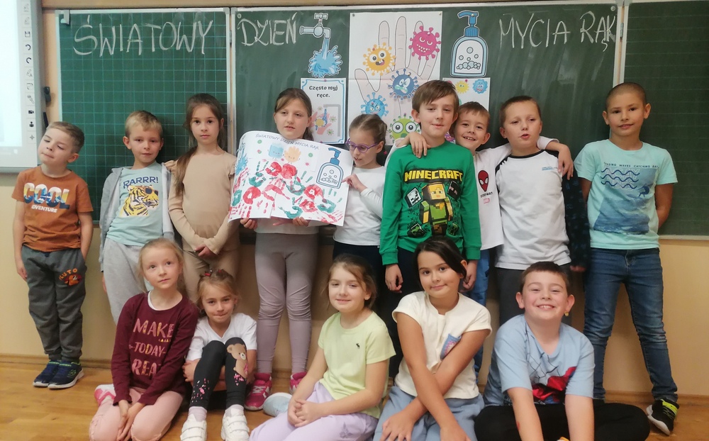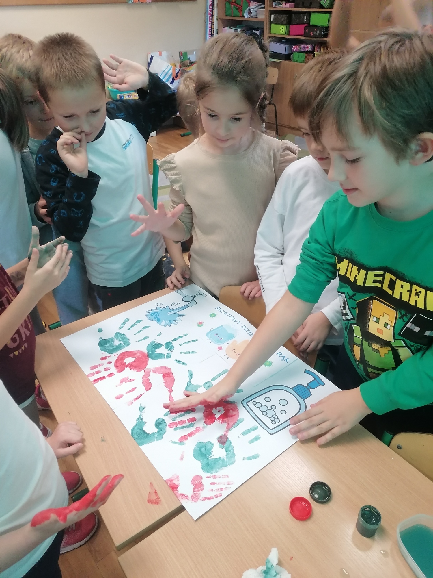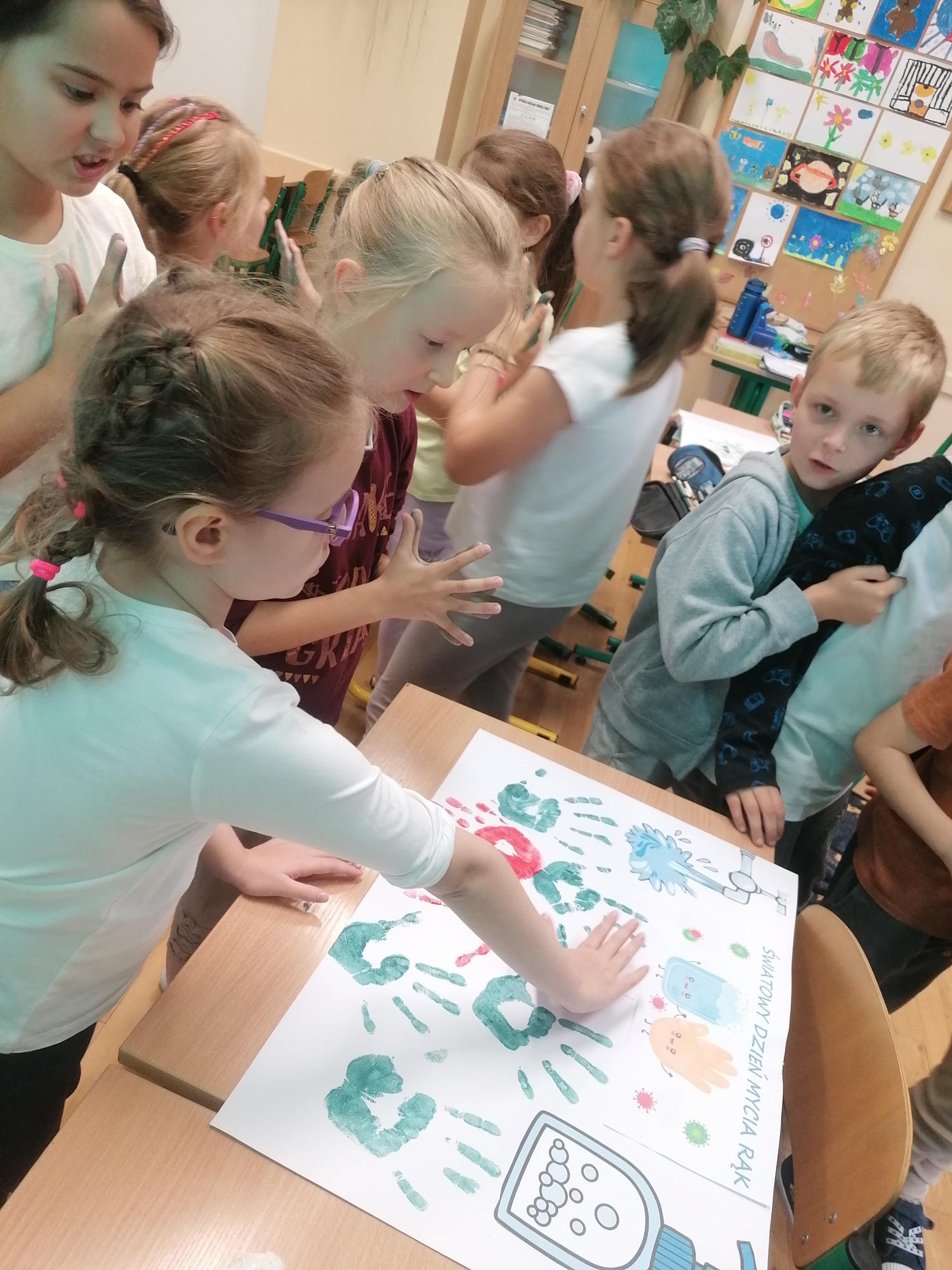 Higiena rąk jest kluczowym działaniem w walce z rozprzestrzenianiem się infekcji. Poprawne mycie rąk to prosta i skuteczna metoda zapobiegania wielu chorobom zakaźnym. Klasa 2b, w ramach Światowego Dnia Mycia Rąk, wzięła udział w zajęciach, których celem było uświadomienie, jak regularne mycie rąk może znacząco przyczynić się do ograniczenia rozprzestrzeniania się chorób zakaźnych i jak może ono wspierać zdrowie każdego człowieka. Uczniowie oglądali prezentację multimedialną na temat szkodliwych bakterii i wirusów, wspólnie przeprowadzili eksperyment pokazujący, jak bakterie „boją się” wody i mydła, wykonali także plakat, a na podsumowanie zajęć wszyscy zadbali o poprawne mycie dłoni, zgodnie z instrukcją.