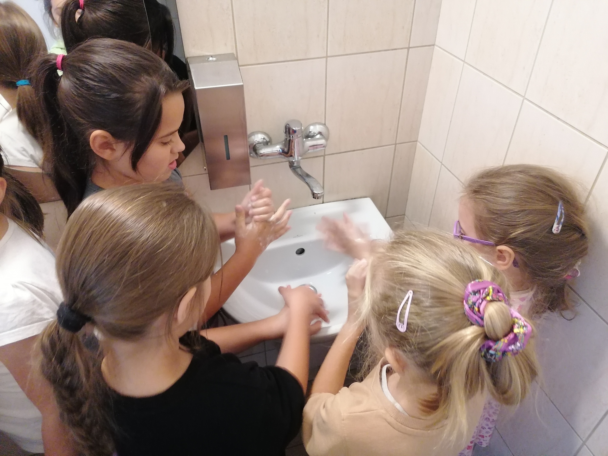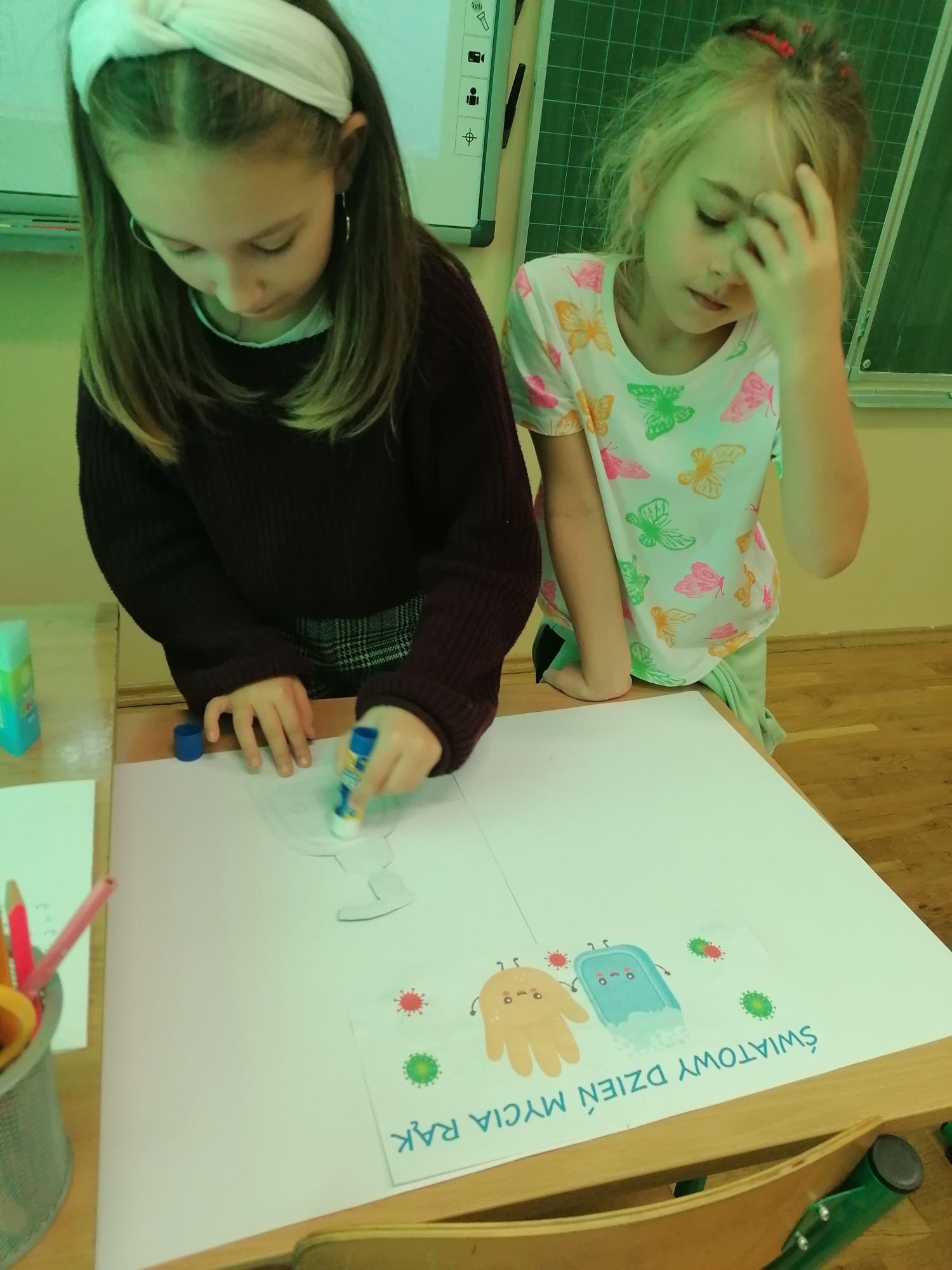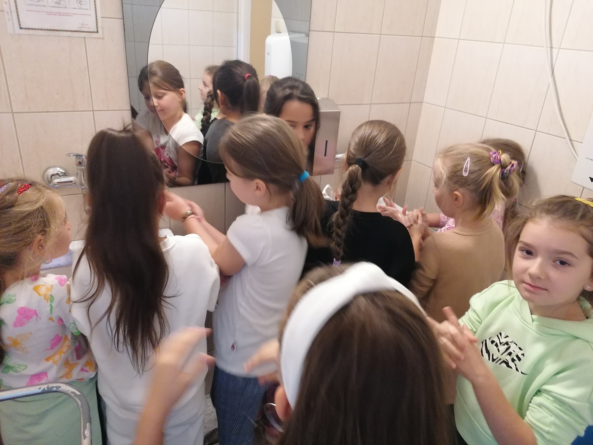 Higiena rąk jest kluczowym działaniem w walce z rozprzestrzenianiem się infekcji. Poprawne mycie rąk to prosta i skuteczna metoda zapobiegania wielu chorobom zakaźnym. Klasa 2b, w ramach Światowego Dnia Mycia Rąk, wzięła udział w zajęciach, których celem było uświadomienie, jak regularne mycie rąk może znacząco przyczynić się do ograniczenia rozprzestrzeniania się chorób zakaźnych i jak może ono wspierać zdrowie każdego człowieka. Uczniowie oglądali prezentację multimedialną na temat szkodliwych bakterii i wirusów, wspólnie przeprowadzili eksperyment pokazujący, jak bakterie „boją się” wody i mydła, wykonali także plakat, a na podsumowanie zajęć wszyscy zadbali o poprawne mycie dłoni, zgodnie z instrukcją.