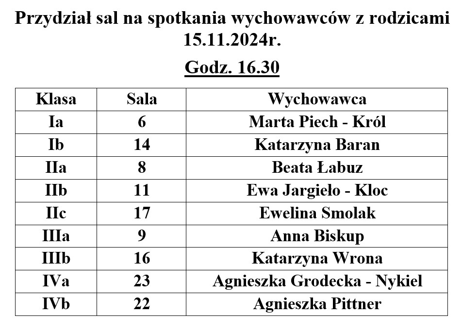 - godz. 1630 – spotkanie dla rodziców uczniów klas 1-4 szkoły podstawowej,