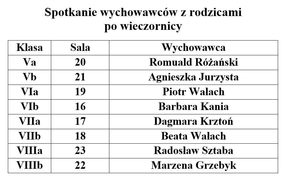 - po wieczornicy spotkanie dla rodziców uczniów klas 5-8 szkoły podstawowej.