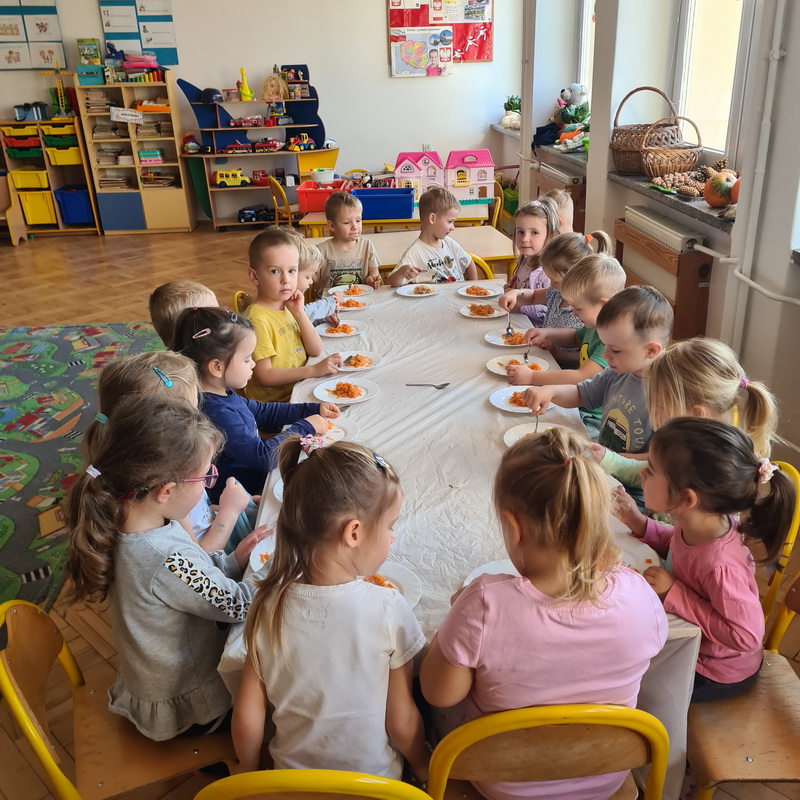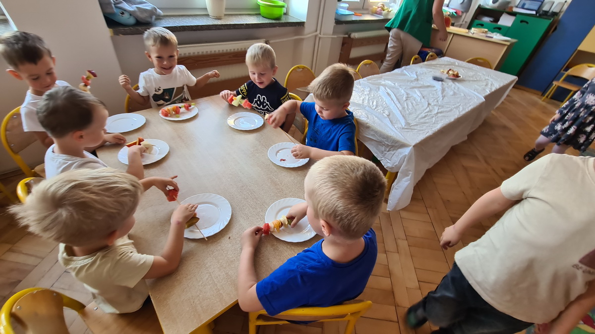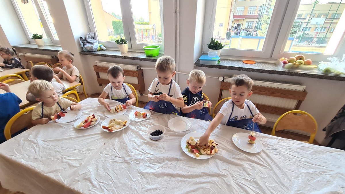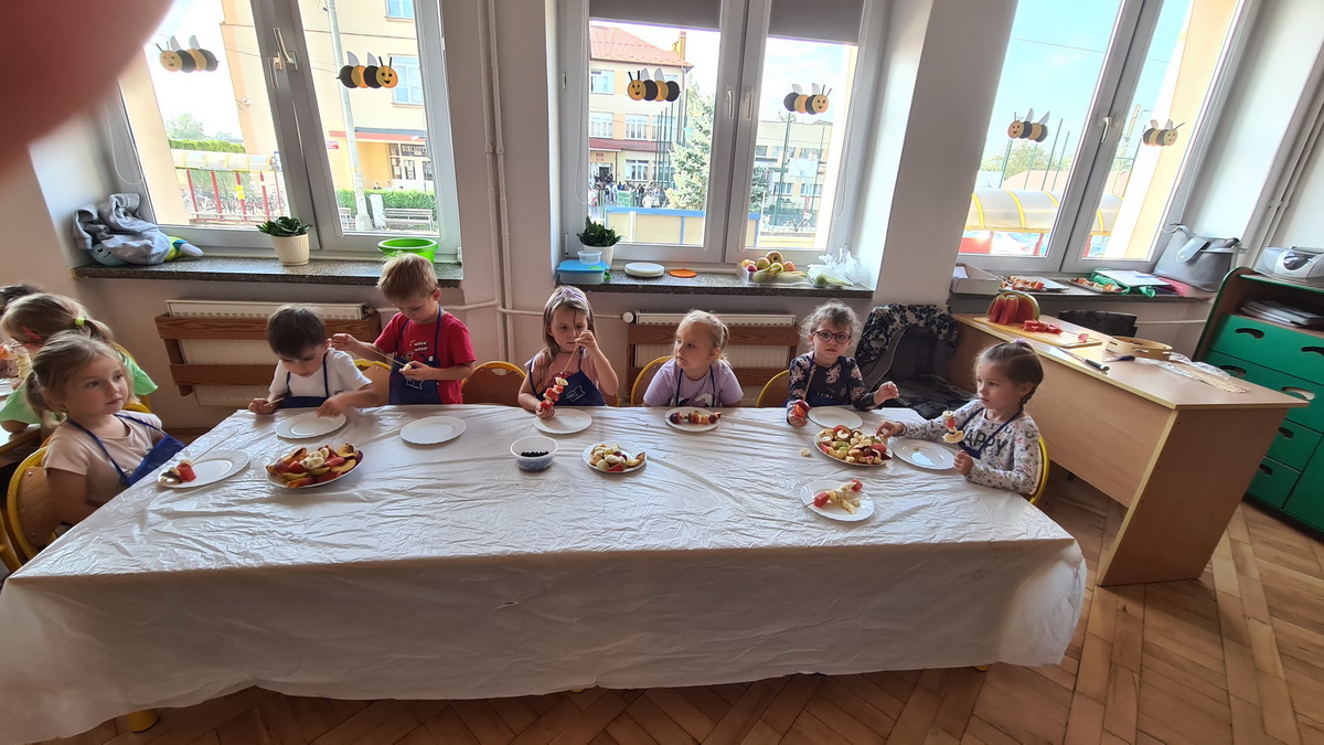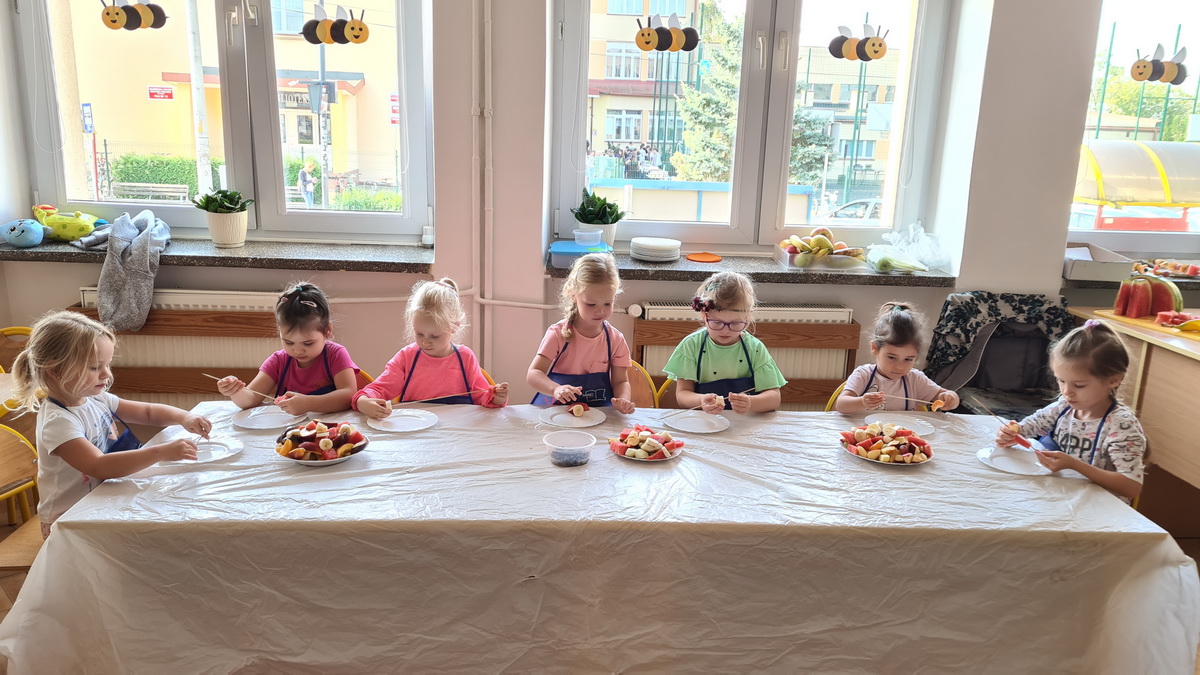 W październiku, w grupie Pszczółek obchodzony był Światowy Dzień Owoców i Warzyw. Głównym celem przeprowadzonych zajęć było zachęcenie dzieci do spożywania warzyw i owoców. Już podczas śniadania, przygotowanego w formie „szwedzkiego stołu”, przedszkolaki miały możliwość skosztowania różnych warzyw. Następnie każde dziecko, z przyniesionych przez siebie owoców, wykonało i zjadło ze smakiem “owocowego szaszłyka”. Zaangażowanie dzieci pokazało, że warzywa i owoce staną się nieodzownym elementem ich codziennej diety.