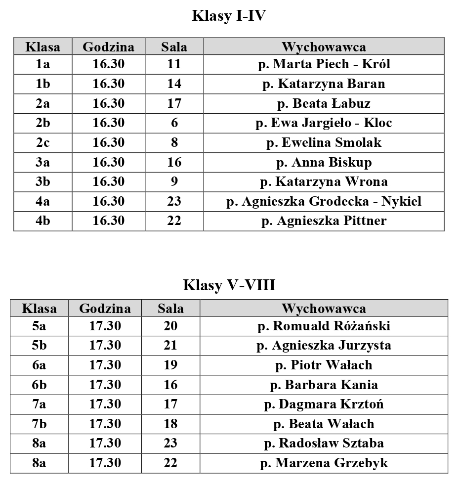 Spotkania wychowawców klas szkoły podstawowej z rodzicami odbędą się 30 stycznia 2025 r. (czwartek) według harmonogramu zamieszczonego poniżej: