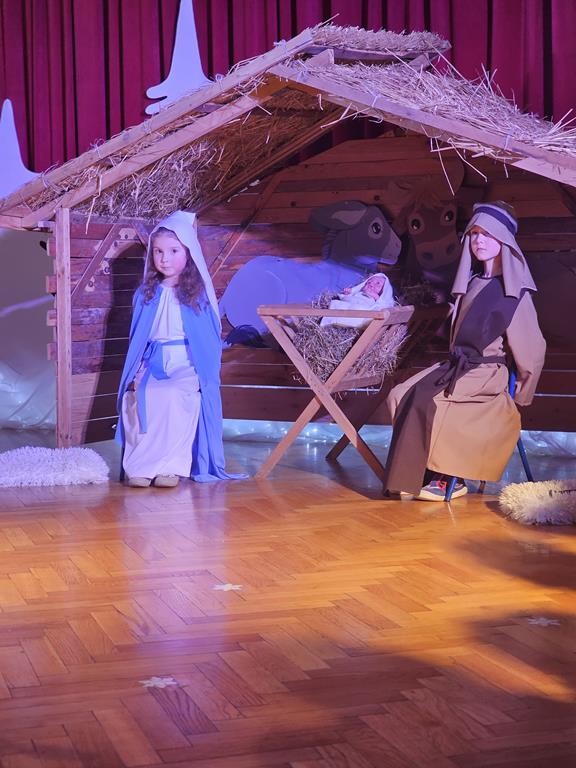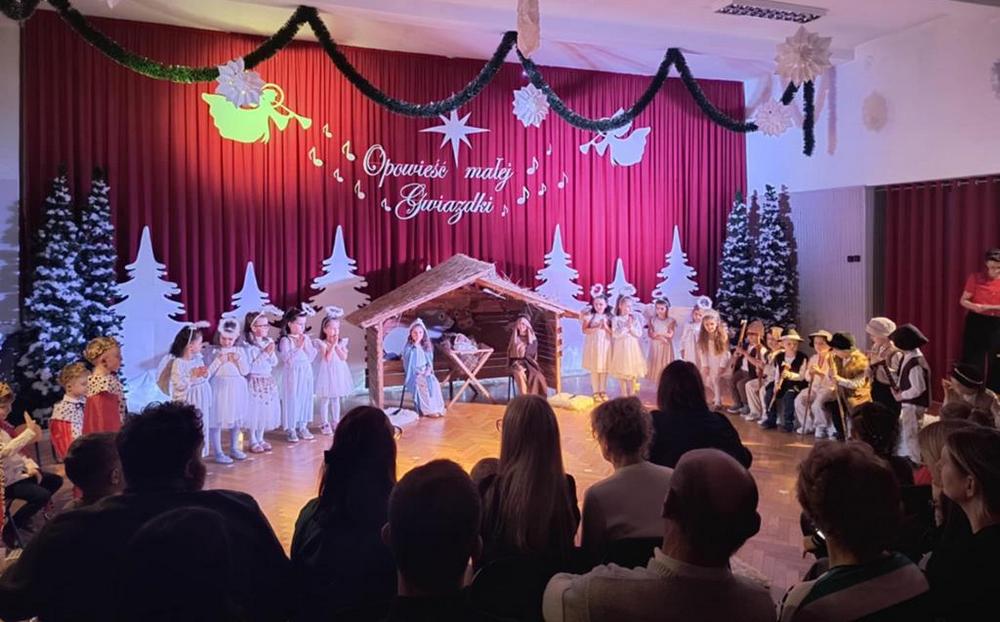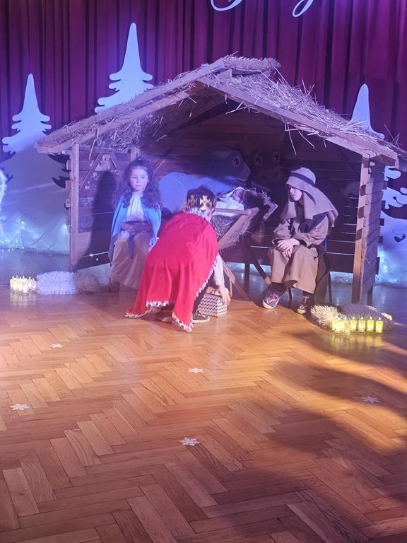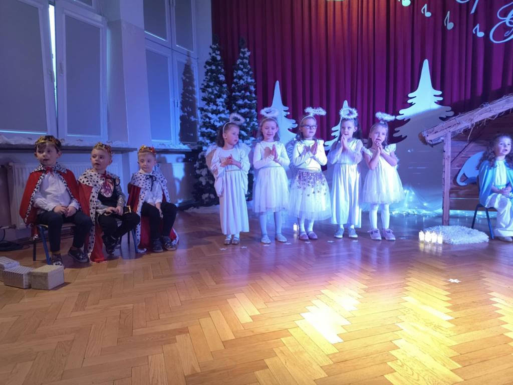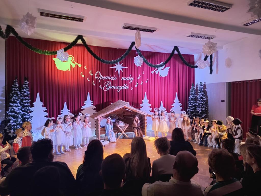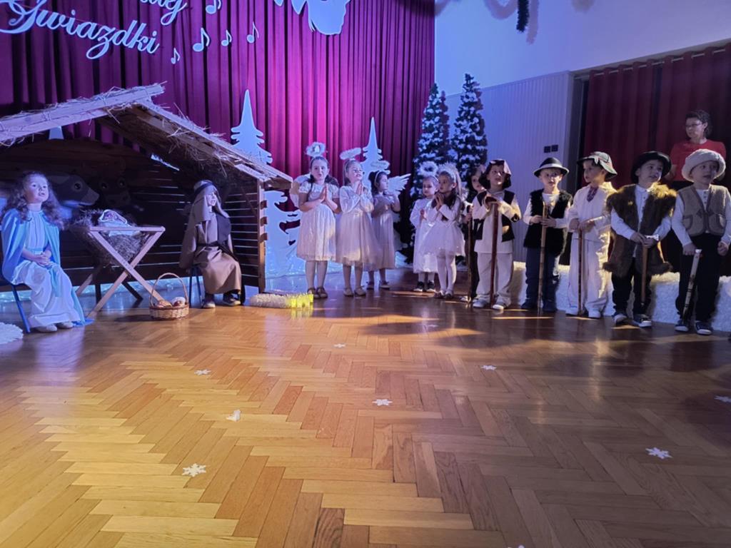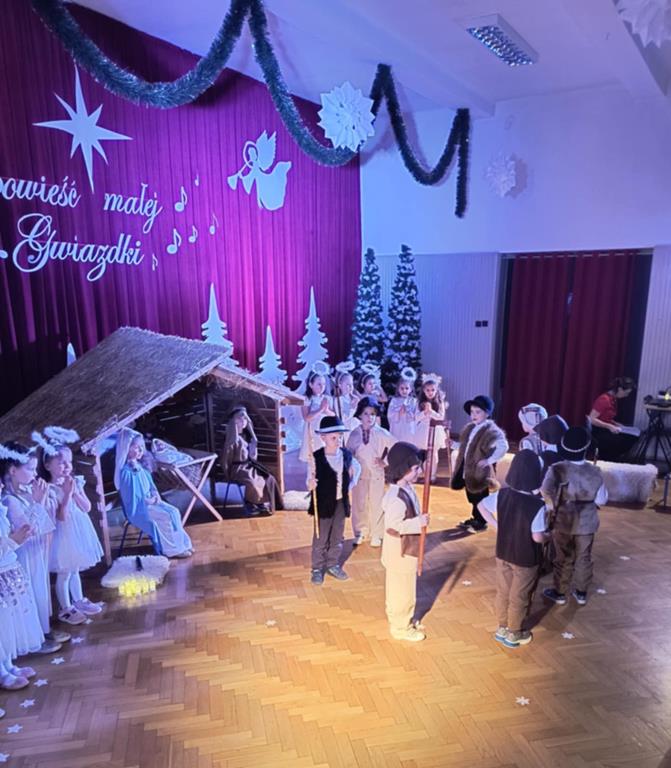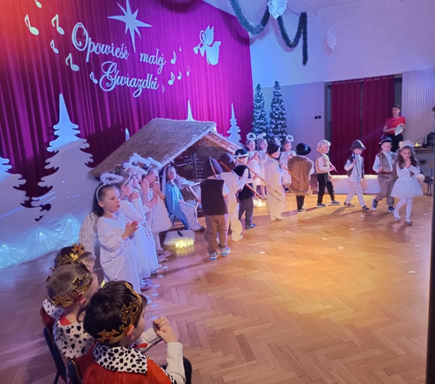 Święta Bożego Narodzenia to czas niezwykły, związany ze zwyczajami i tradycjami. Jedną z nich są jasełka – widowisko, którego treścią jest historia przyjścia na świat Pana Jezusa. Przedstawienie jasełkowe dla rodziców i przybyłych gości pt. “Opowieść małej Gwiazdki” przygotowała grupa IV, Misie. Przedszkolaki wcieliły się w postacie Maryi, Józefa, aniołów, Gwiazdki, pastuszków i królów. Mali artyści z dużym przejęciem i zaangażowaniem wiernie odtworzyli swoje role oraz zaprezentowali umiejętności wokalne i recytatorskie. Piękna sceneria, dźwięki kolęd i pastorałek nadały temu wydarzeniu wyjątkowy i uroczysty klimat.