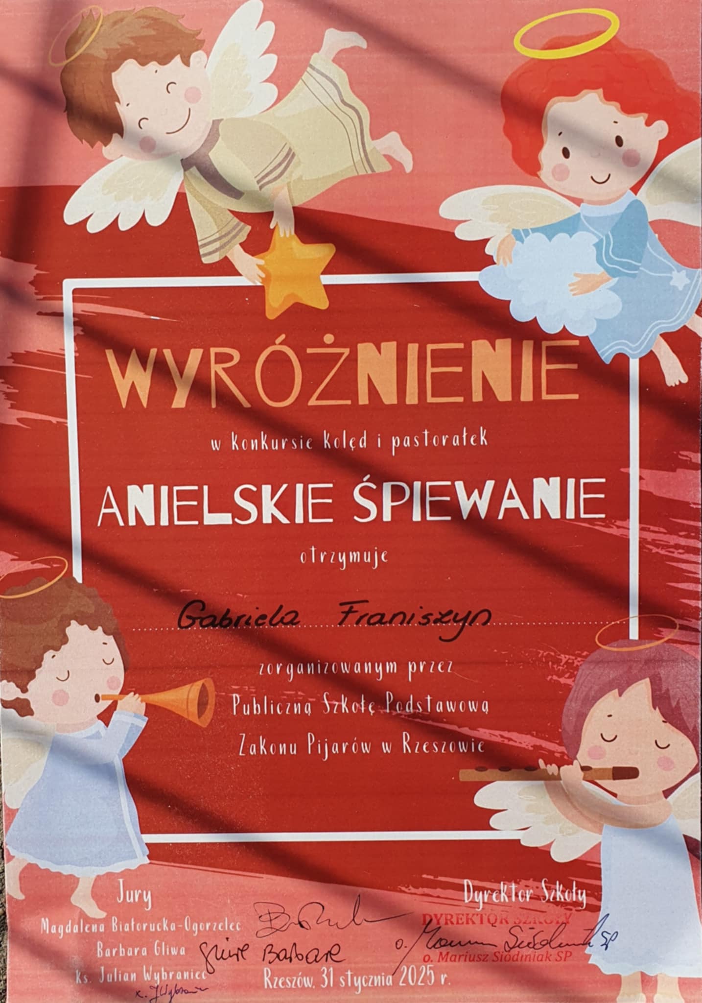 Jak podkreśliła przewodnicząca jury, Magdalena Białorucka – Ogorzelec, poziom konkursu w tym roku był bardzo wysoki. Tym bardziej miło nam było odebrać wyróżnienie dla Gabrieli Franiszyn w kategorii soliści za utwór pt. ”Cuda dzieją się” oraz dyplom i statuetkę, które zdobyliśmy za zajęcie 3 miejsca w kategorii zespoły, śpiewając kolędę „Jezusa narodzonego”. W konkursie wzięło udział 290 wykonawców z całego województwa.