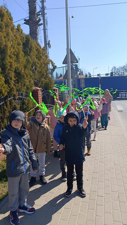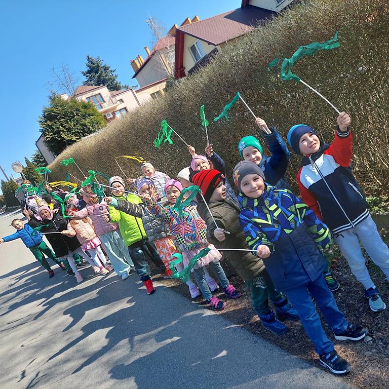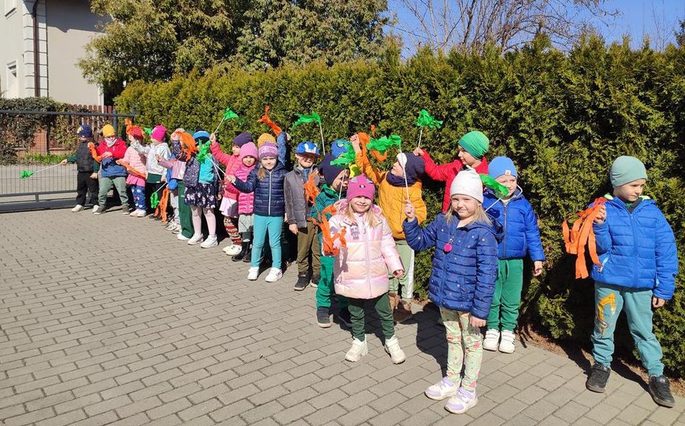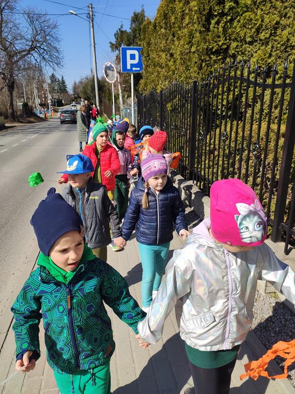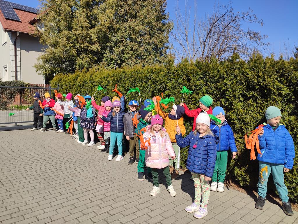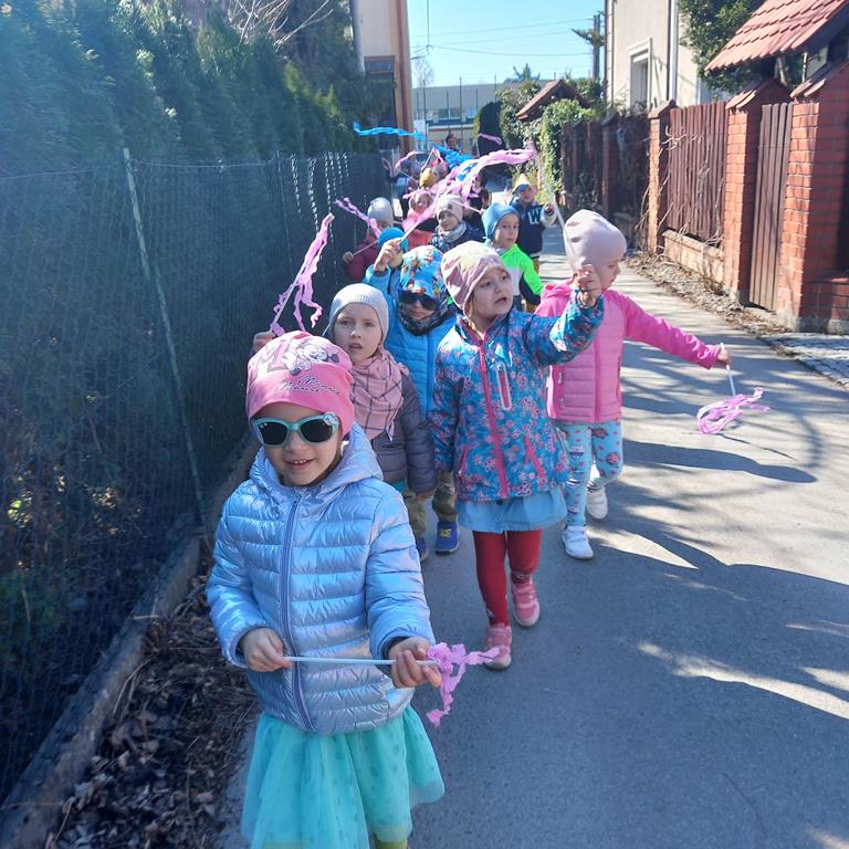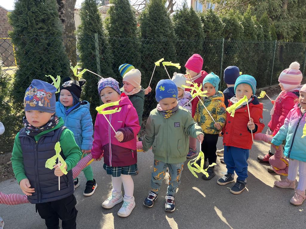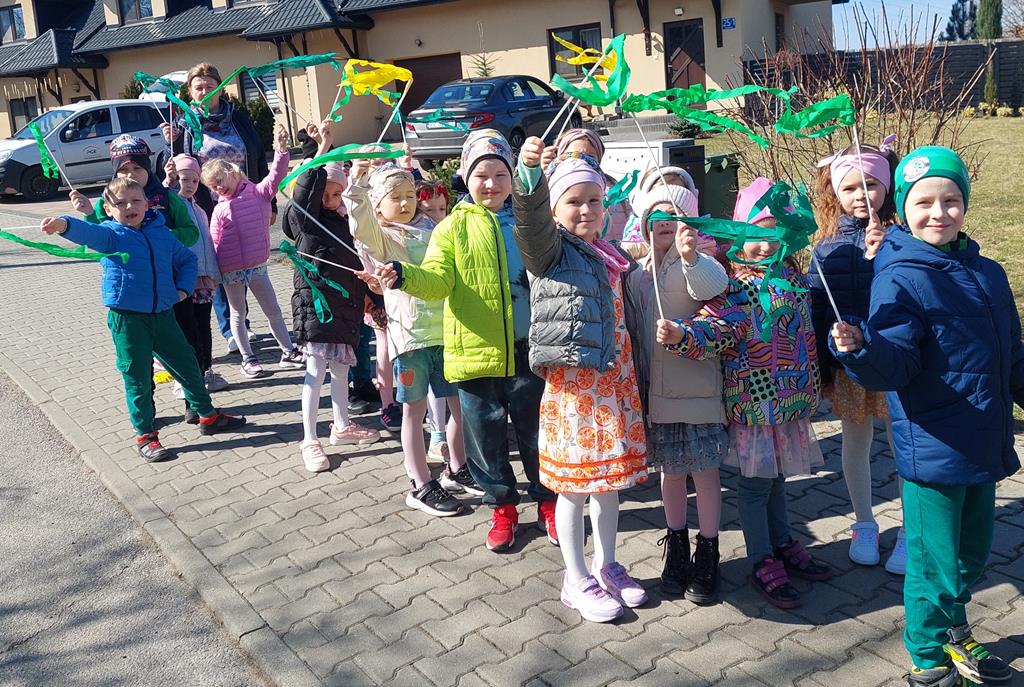 Każda grupa miała własne wiosenne akcenty – kolorowe wstążeczki, które dodały naszemu korowodowi lekkości i energii. Wyruszyliśmy na wesoły przemarsz wokół przedszkola, śpiewając wesołe piosenki o wiośnie i budzącej się do życia przyrodzie. Radosne okrzyki i śmiechy rozbrzmiewały w całej okolicy, przyciągając uśmiechy przechodniów. Nie zabrakło również wspólnych zabaw, podczas których dzieci mogły poszukać pierwszych oznak wiosny.