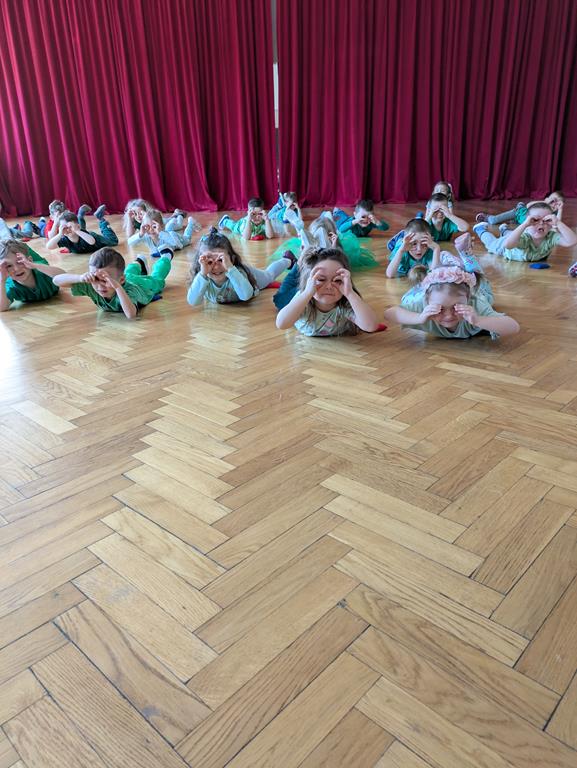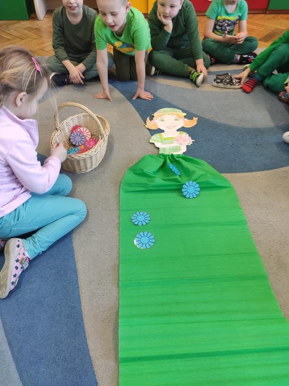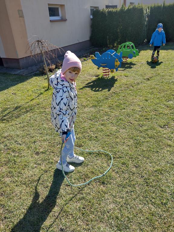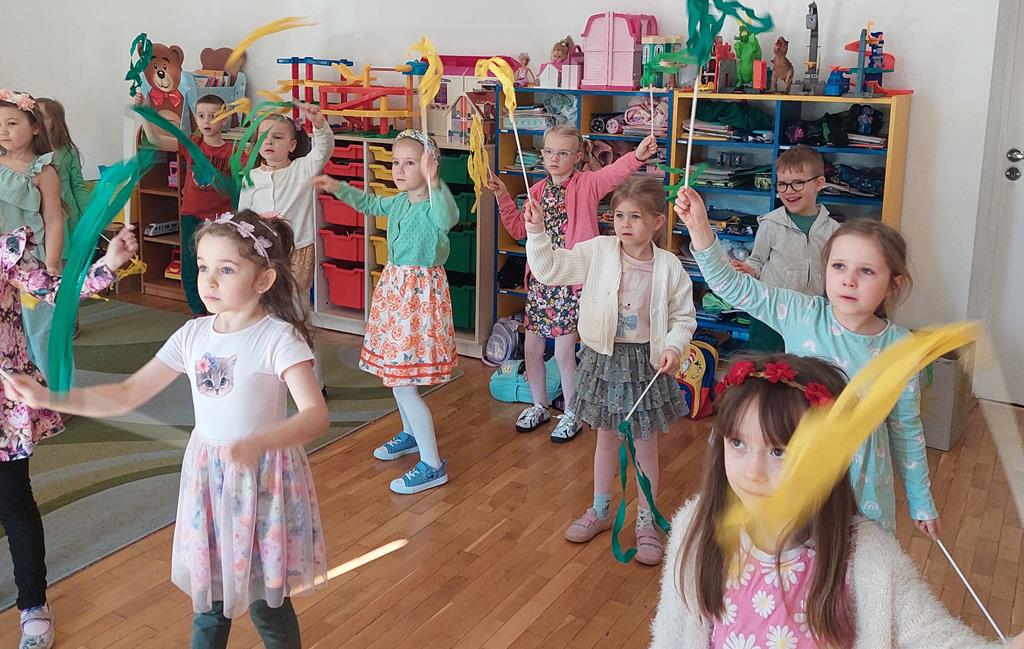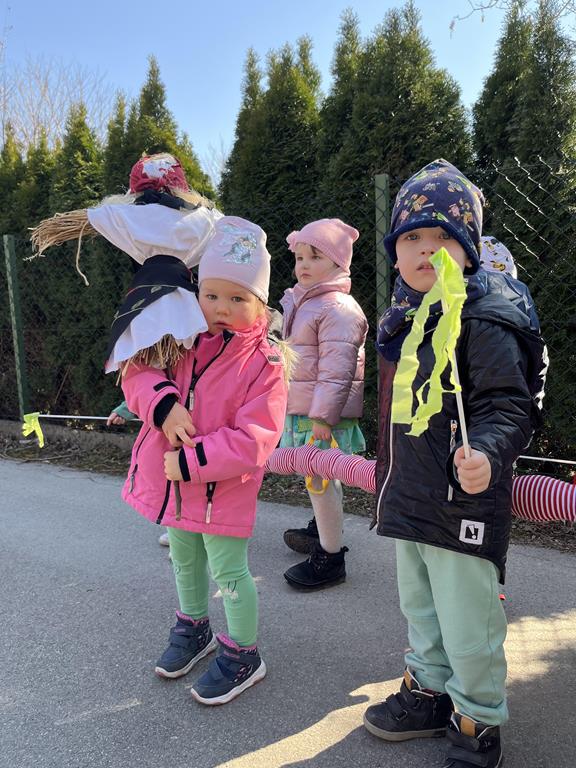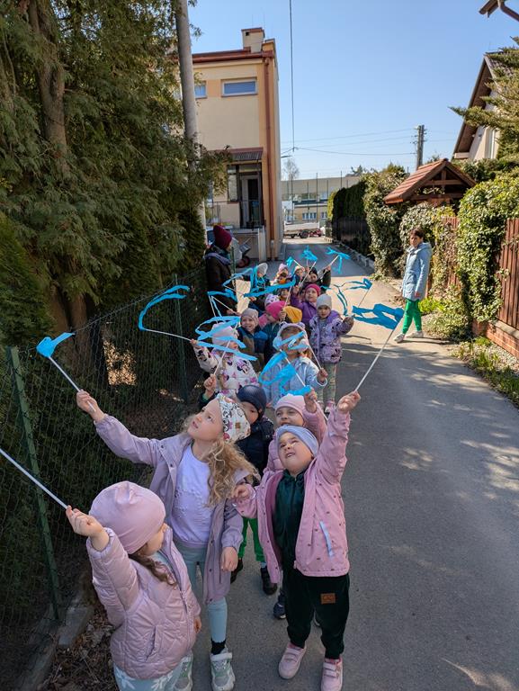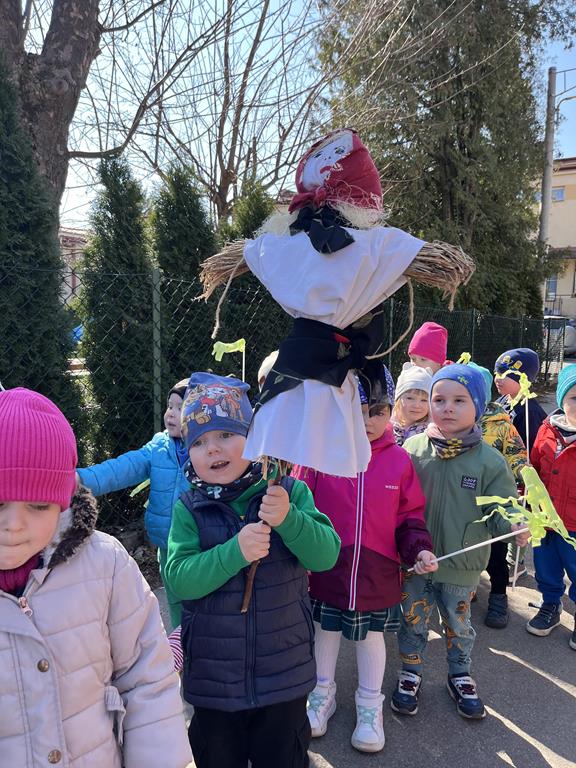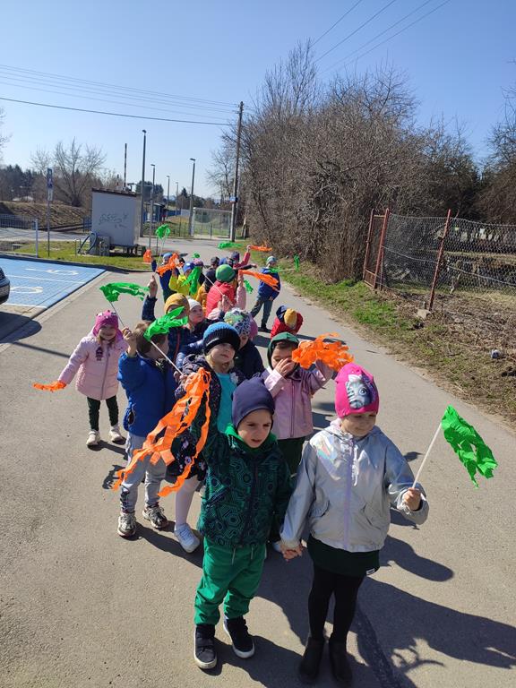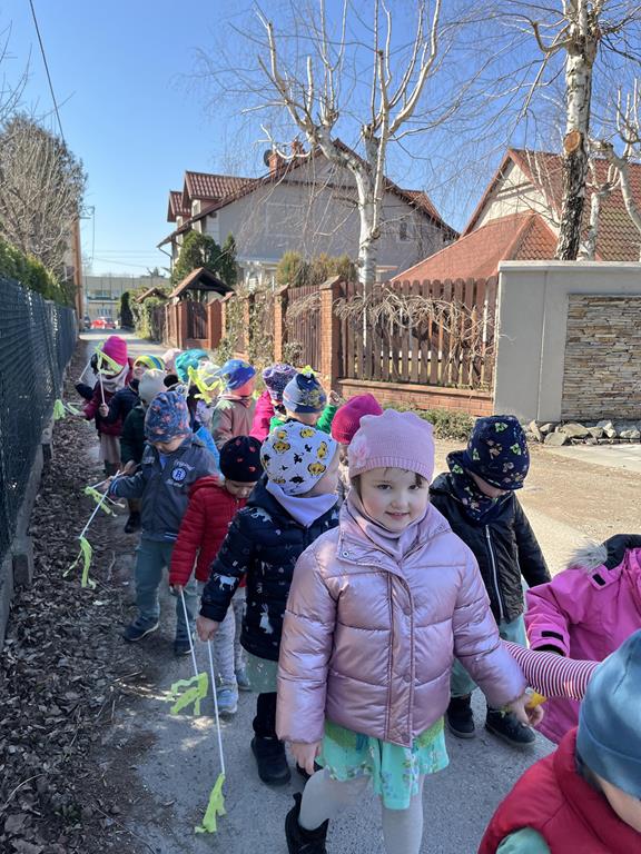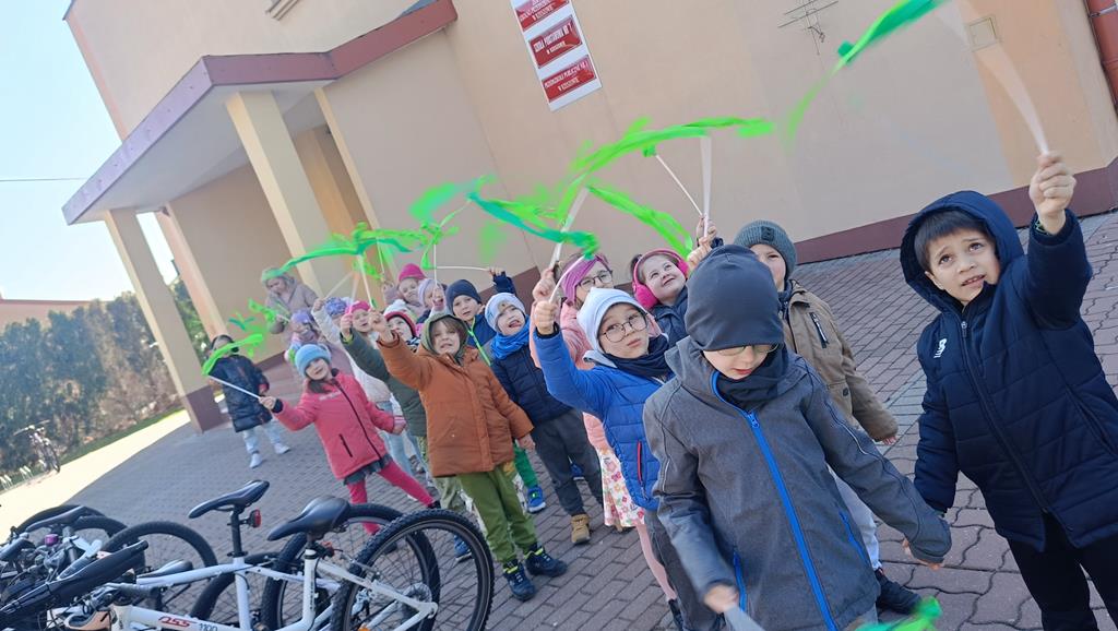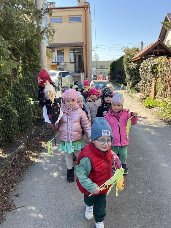 Każda grupa miała własne wiosenne akcenty – kolorowe wstążeczki, które dodały naszemu korowodowi lekkości i energii. Wyruszyliśmy na wesoły przemarsz wokół przedszkola, śpiewając wesołe piosenki o wiośnie i budzącej się do życia przyrodzie. Radosne okrzyki i śmiechy rozbrzmiewały w całej okolicy, przyciągając uśmiechy przechodniów. Nie zabrakło również wspólnych zabaw, podczas których dzieci mogły poszukać pierwszych oznak wiosny.