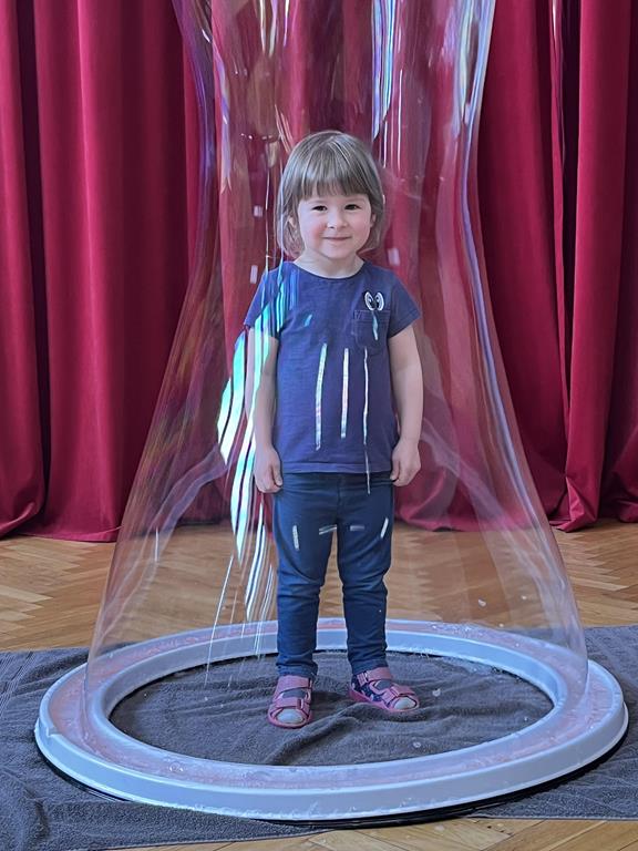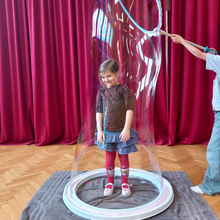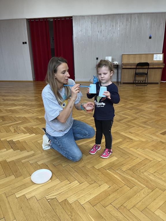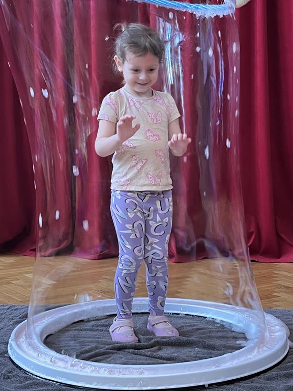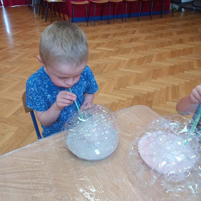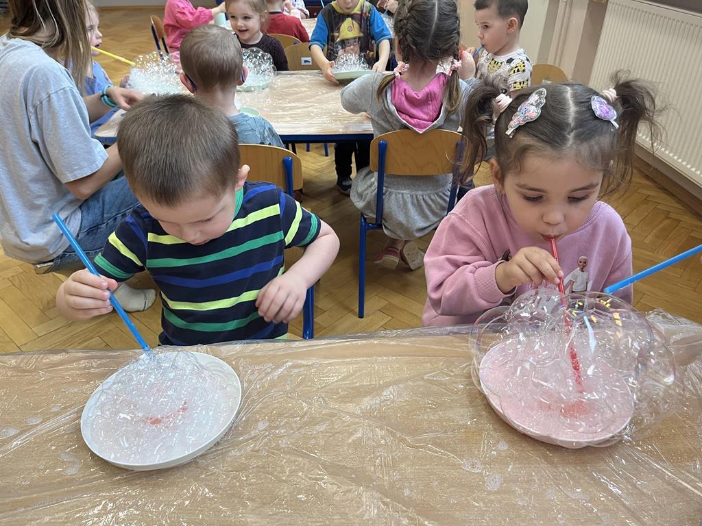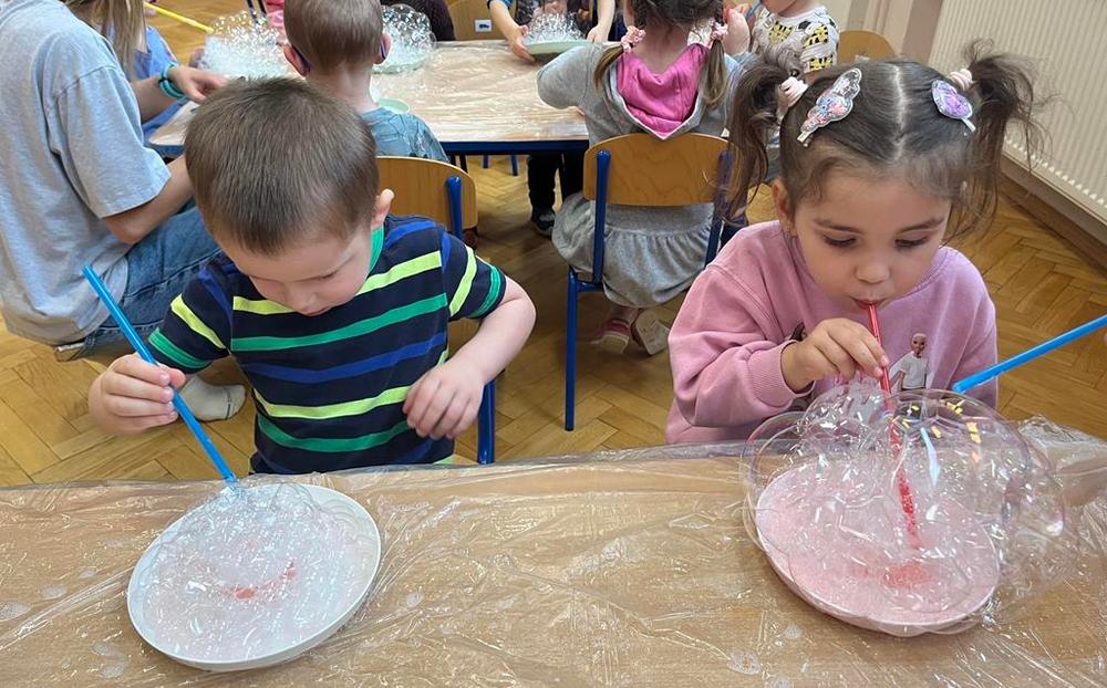Podczas zajęć najmłodsi mieli okazję dowiedzieć się, co kryje się w magicznych, mieniących się kolorami bańkach. Przez chwilę mogli poczuć się, jak podróżnicy w kosmosie, dryfujący w przezroczystej rakiecie utworzonej z gigantycznej bańki mydlanej. Po tej ekscytującej przygodzie przyszedł czas na samodzielne eksperymenty – dzieci z zapałem tworzyły własne, bajecznie kolorowe bańki.