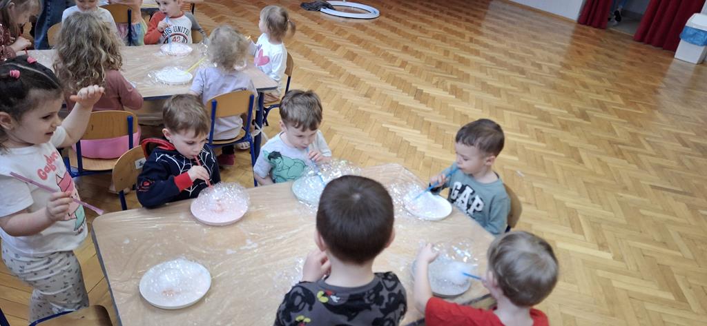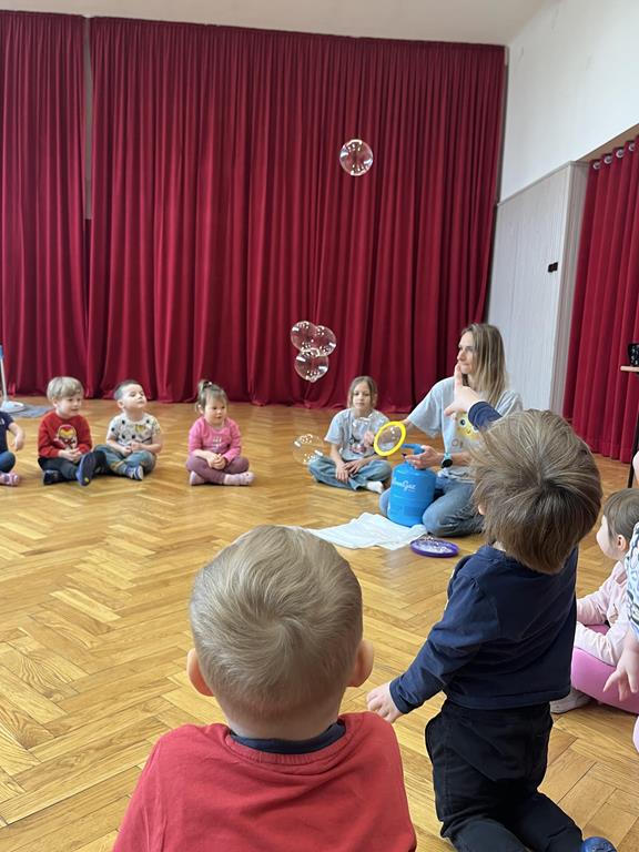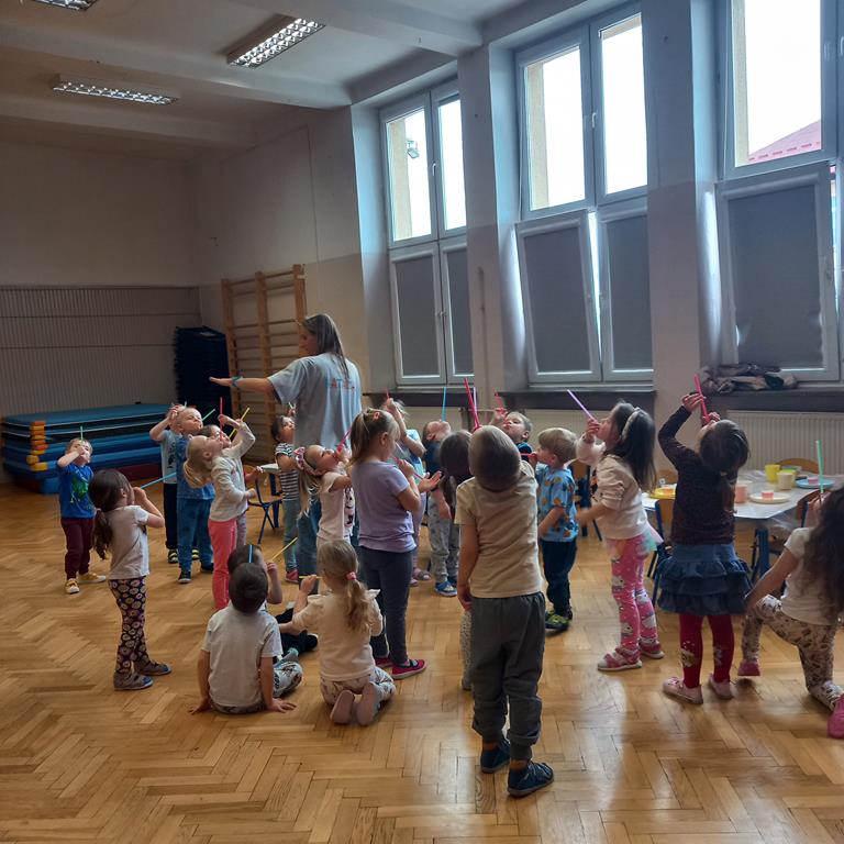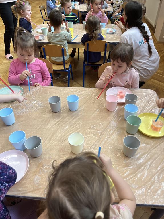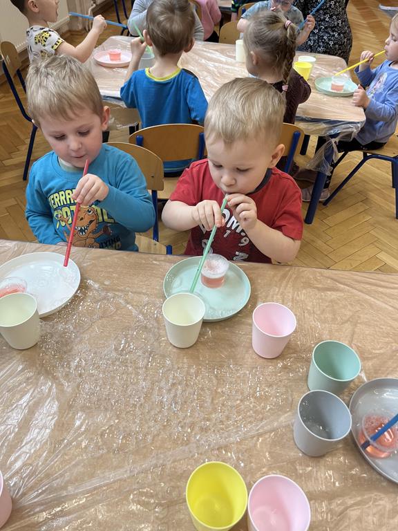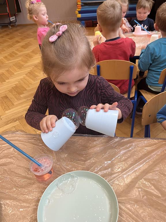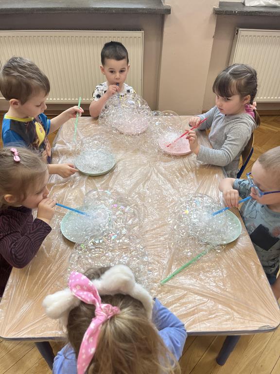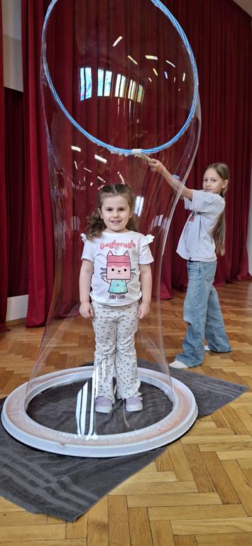 Podczas zajęć najmłodsi mieli okazję dowiedzieć się, co kryje się w magicznych, mieniących się kolorami bańkach. Przez chwilę mogli poczuć się, jak podróżnicy w kosmosie, dryfujący w przezroczystej rakiecie utworzonej z gigantycznej bańki mydlanej. Po tej ekscytującej przygodzie przyszedł czas na samodzielne eksperymenty – dzieci z zapałem tworzyły własne, bajecznie kolorowe bańki.
