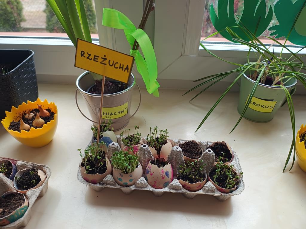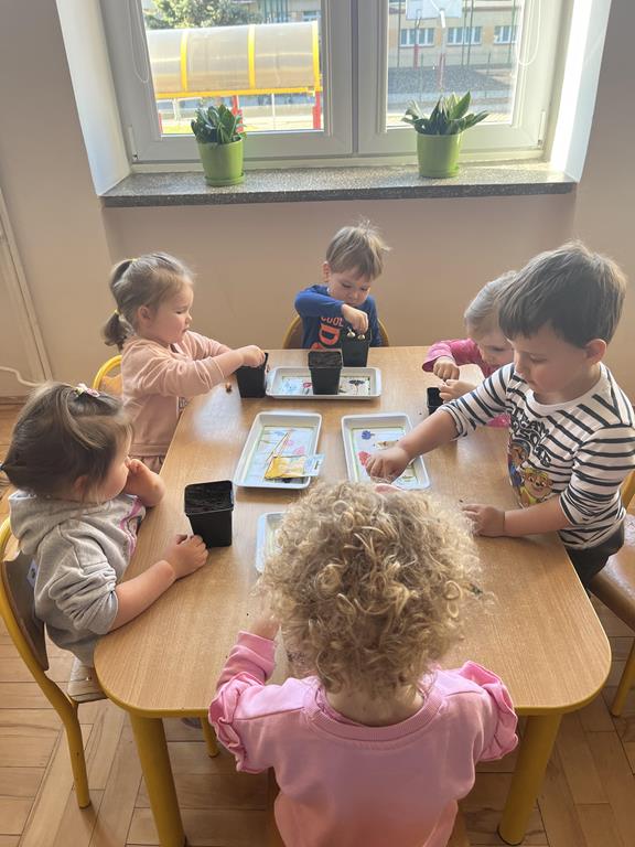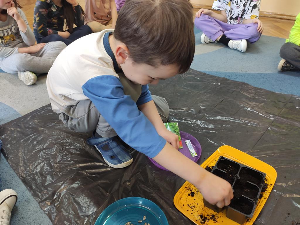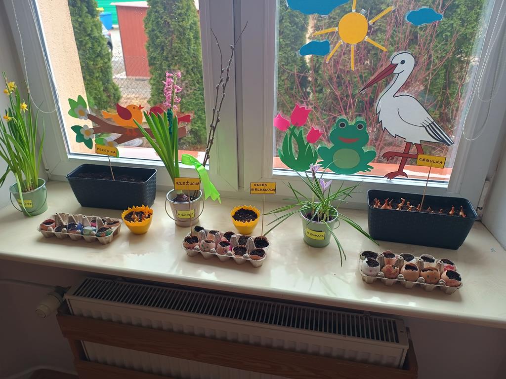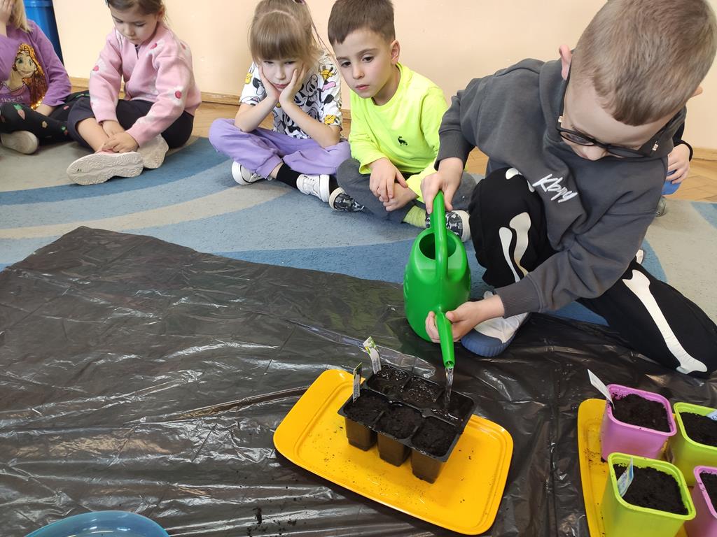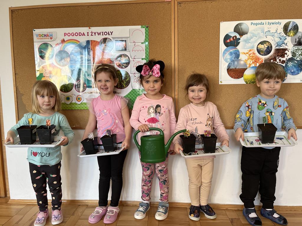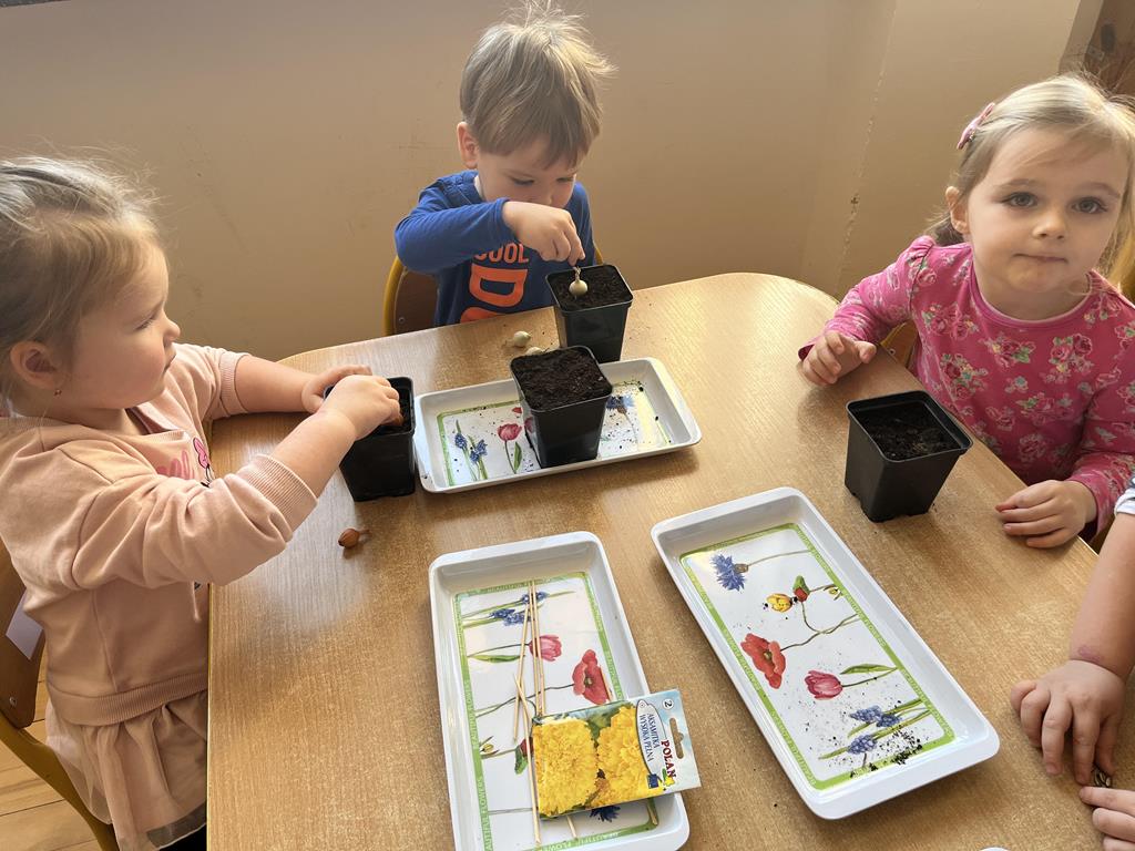 Jest to piękna pora roku, którą możemy rozbudzić u dzieci zainteresowanie zmianami zachodzącymi w przyrodzie, toteż przedszkolaki sadziły oraz siały różnorodne nasiona: aksamitki, rzeżuchę, pszenicę, cebulkę, fasolę i pietruszkę. W naszych kącikach pojawiły się również piękne kwiaty oraz pnącza.