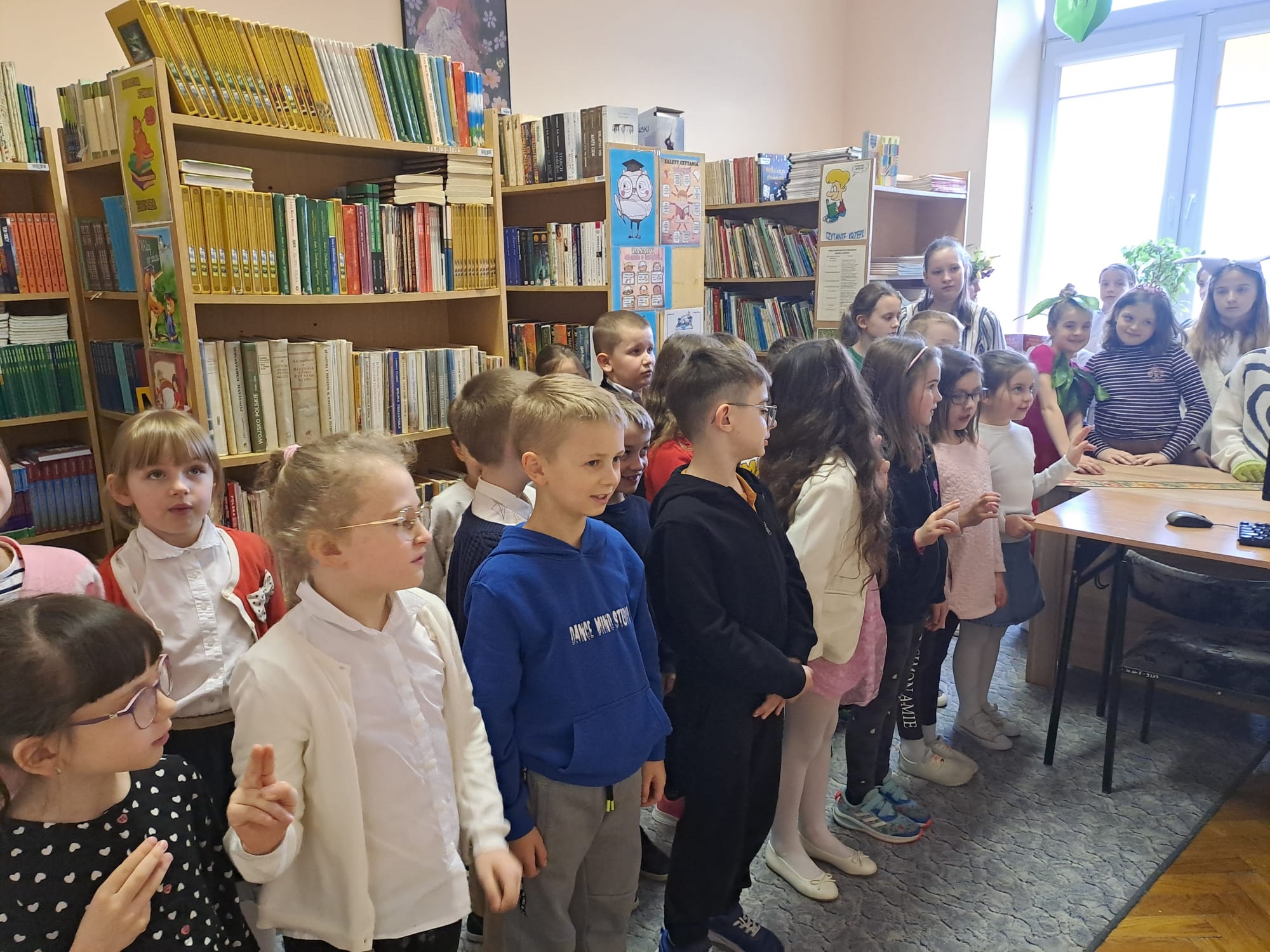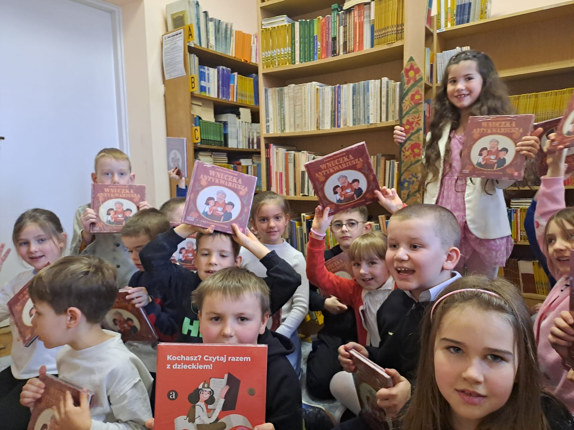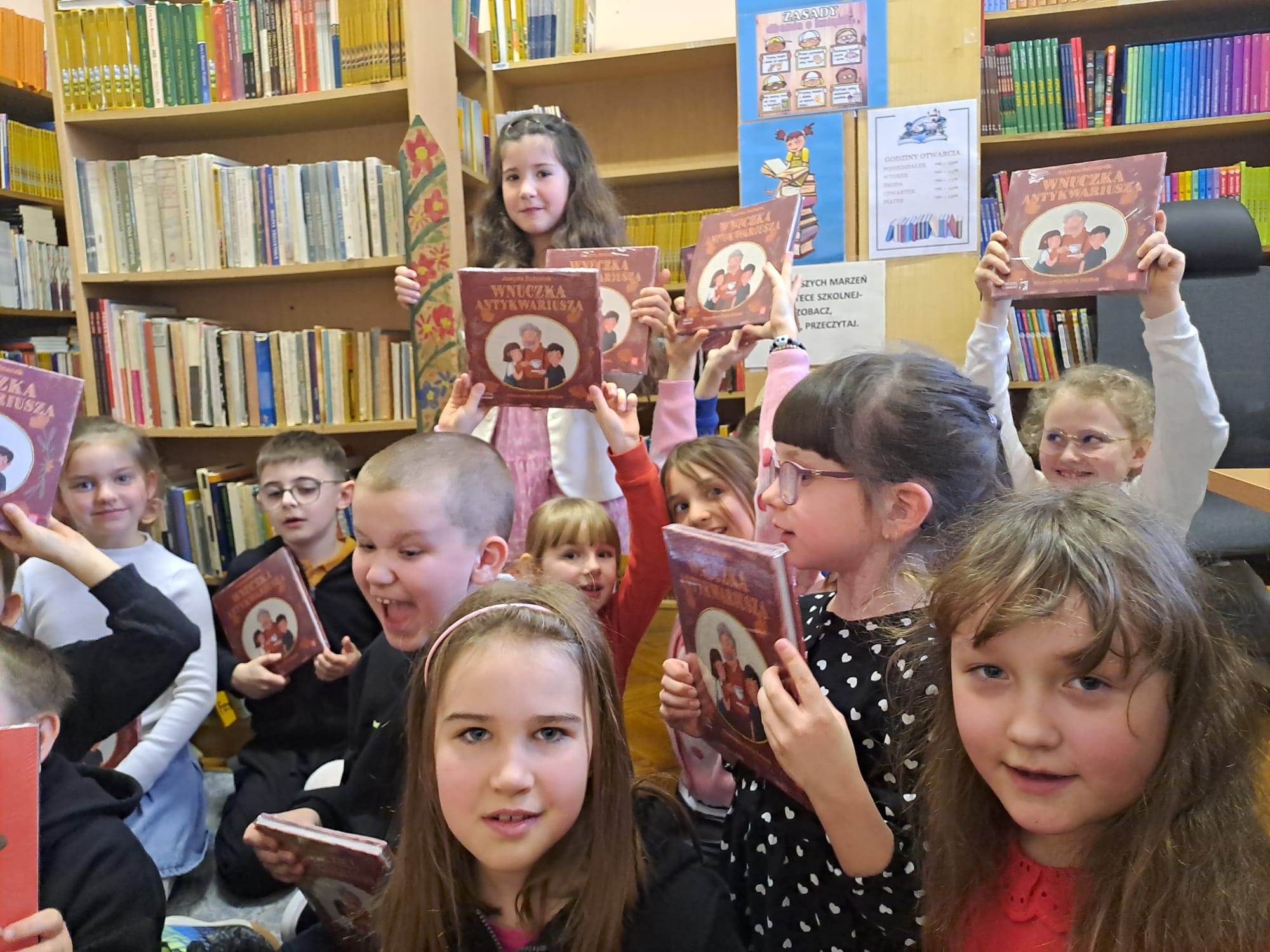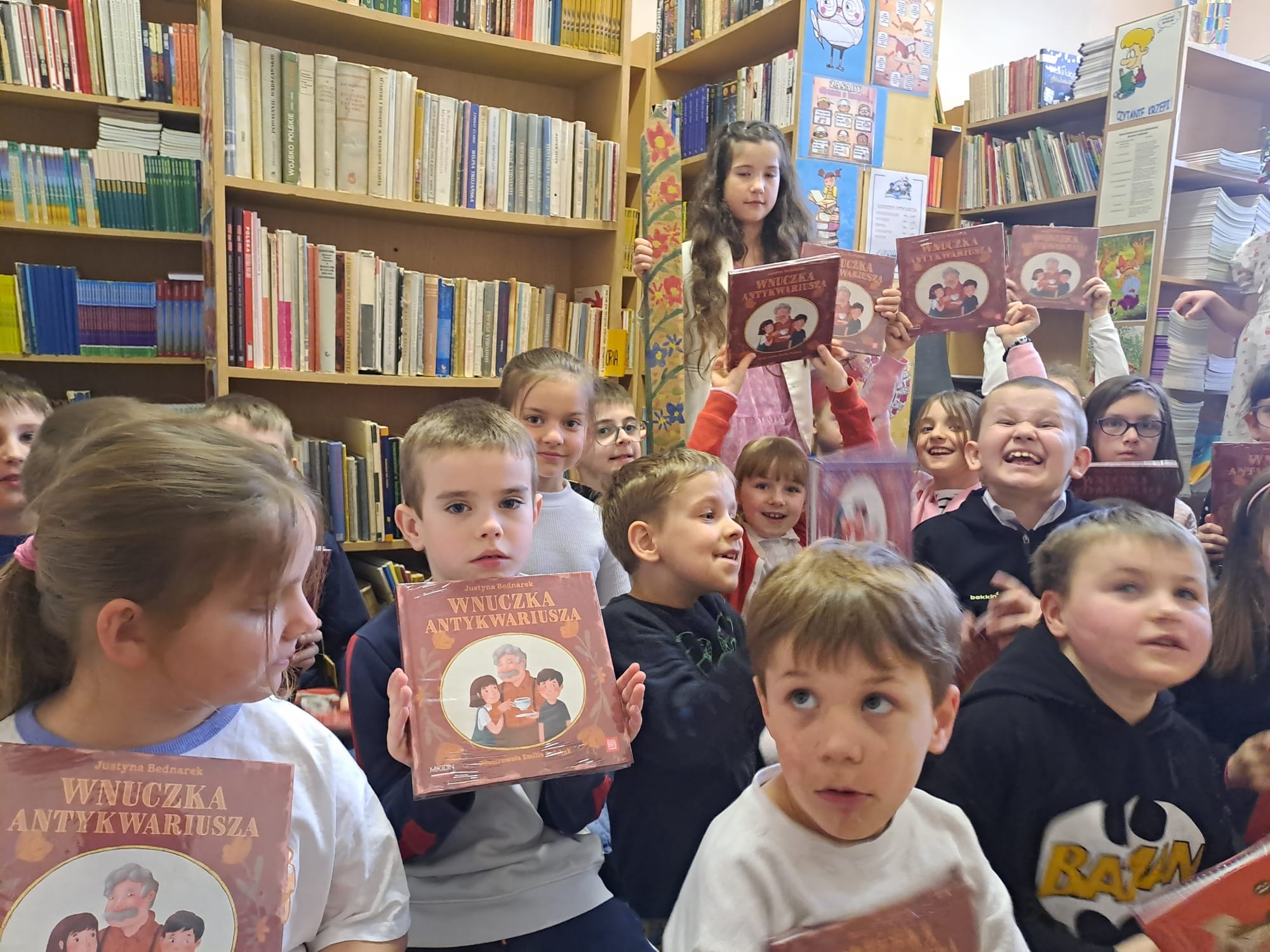 Pierwszoklasiści obejrzeli występ laureatów konkursu recytatorskiego “Ulubione wiersze Brzechwy i Tuwima”, wysłuchali piosenek inspirowanych wierszami Jana Brzechwy, odgadywali bajkowe zagadki, dowiedzieli się, jak należy dbać o książki i jak zachowywać się w bibliotece. Dzieci złożyły uroczyste przyrzeczenie, że będą zawsze szanować książki. Na pamiątkę tego wydarzenia wszyscy uczniowie otrzymali pamiątkowe książeczki “Wnuczka antykwariusza”.