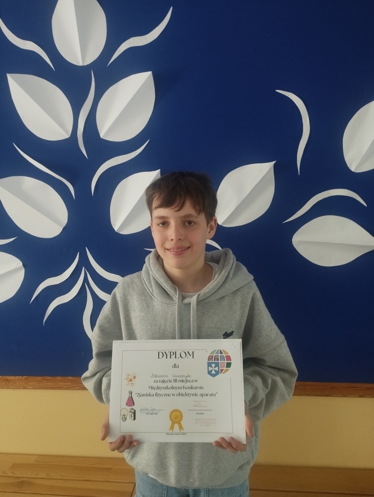 W innym konkursie – „Zjawiska fizyczne w obiektywie aparatu fotograficznego” Aleksander Gancarczyk (kl. 6a) w nieszablonowy sposób przedstawił oraz opisał zjawisko elektryzowania ciał i również uplasował się na III miejscu.
