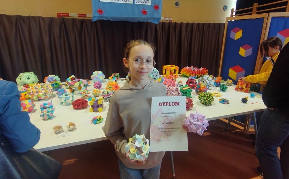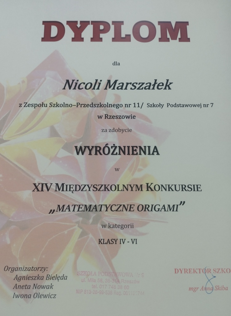 Uczennica klasy 5a, Nicola Marszałek zdobyła wyróżnienie konkursie “Matematyczne origami”. W rywalizacji wzięło udział 12 szkół z terenu województwa podkarpackiego. Komisja konkursowa zwracała uwagę na pomysłowość, precyzję wykonania, stopień trudności oraz wierność sztuce origami.