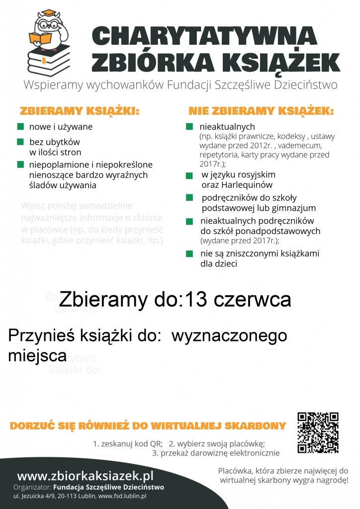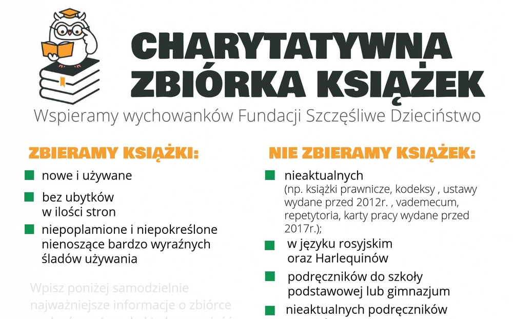 Zapraszamy do udziału w “Charytatywnej zbiórce książek 2025”. Konkurs polega na zebraniu jak największej ilości książek w okresie na to przeznaczonym. Zbierane pozycje mogą być nowe lub używane. Głównym celem tej rywalizacji jest wsparcie funduszu, z którego wypłacane są stypendia oraz wsparcie dla dzieci i młodzieży, wychowanków Fundacji Szczęśliwe Dzieciństwo.