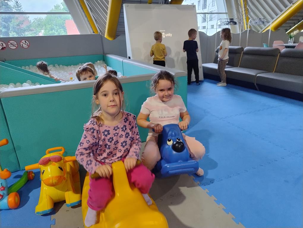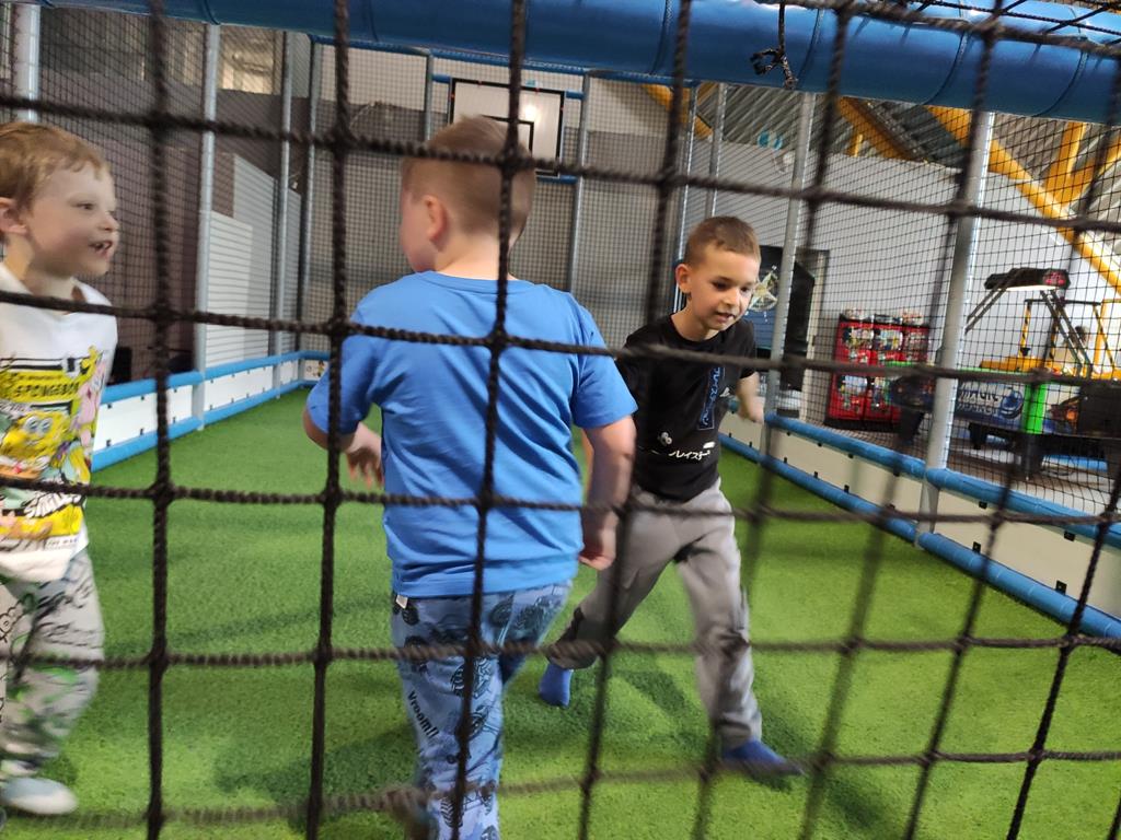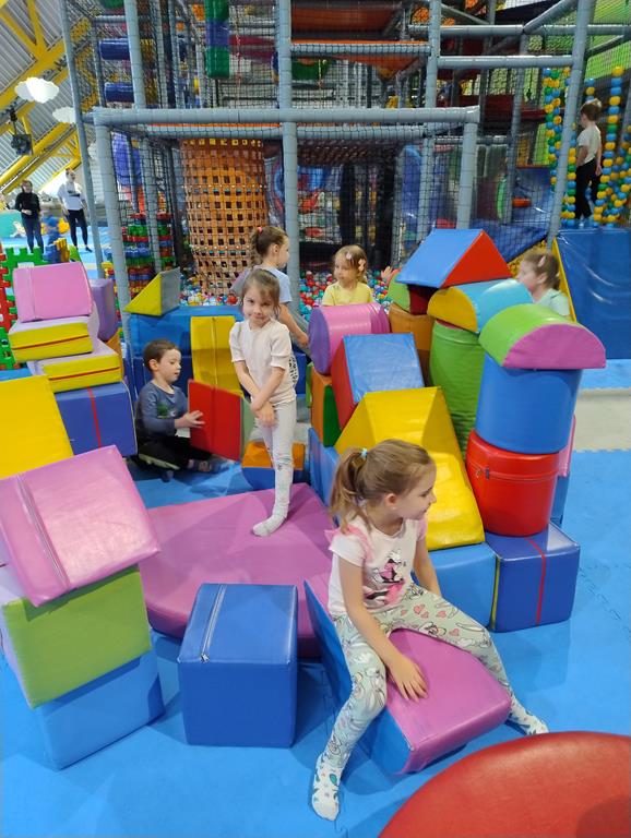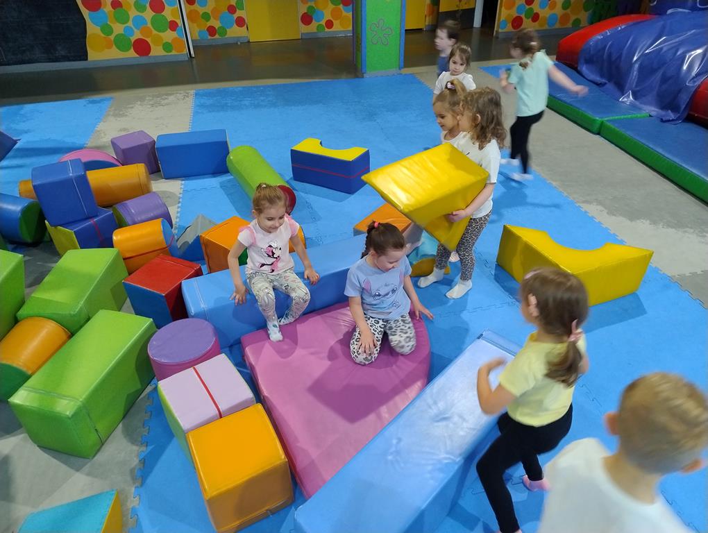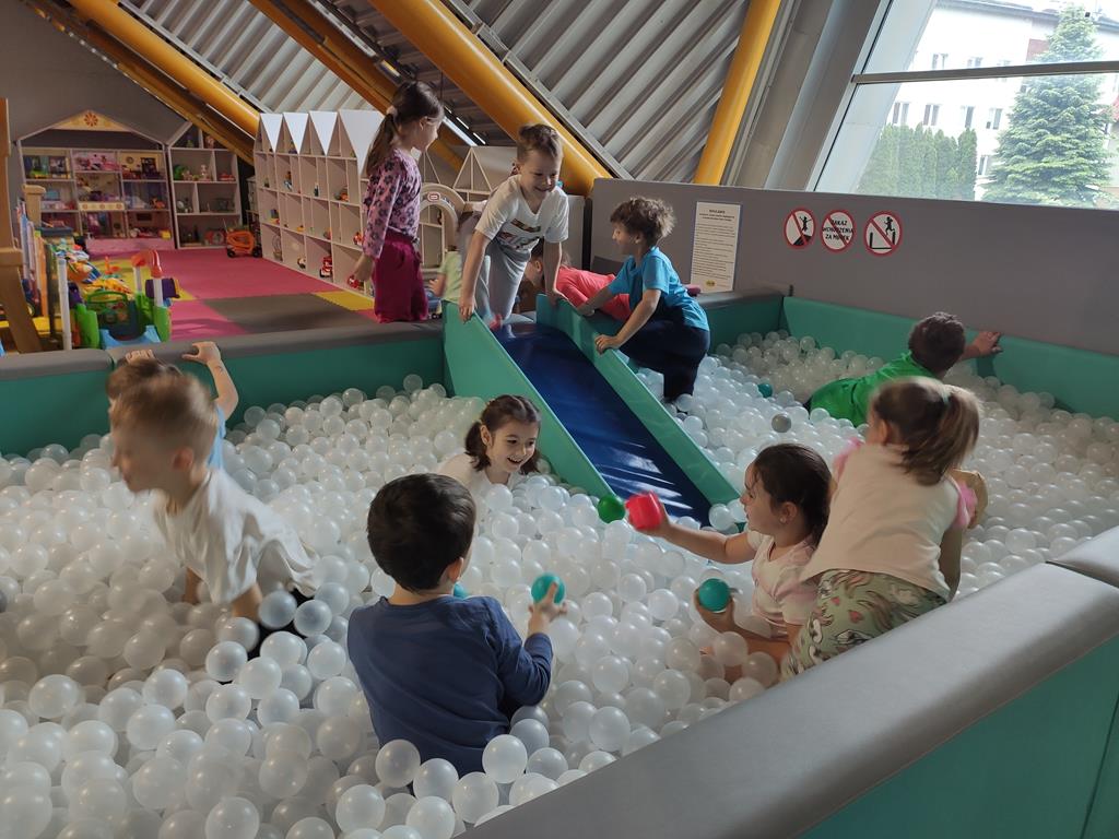 Sala zabaw Fantazja to kolorowa, bezpieczna przestrzeń, stworzona z myślą o dzieciach. Po przyjeździe dzieci z szerokimi uśmiechami rzuciły się w wir przygód – czekały na nie liczne atrakcje: wielopoziomowe konstrukcje do wspinania, labirynty, tunele, mostki, zjeżdżalnie, baseny z piłkami i trampoliny. Każdy maluch mógł znaleźć coś dla siebie – od intensywnej zabawy ruchowej po spokojniejsze zajęcia rozwijające wyobraźnię. W czasie zabawy dzieci integrowały się, uczyły współpracy, a także rozwijały swoje umiejętności motoryczne. Radość była ogromna – uśmiechy nie znikały z twarzy nawet na chwilę, a w sali słychać było śmiech i okrzyki zachwytu. Po intensywnej zabawie przyszedł czas na przerwę i regenerację sił. Dzieci z apetytem zjadły przygotowane przekąski, wymieniając się wrażeniami i przeżyciami. To był też moment na odpoczynek i wspólne rozmowy w przyjaznej atmosferze.
