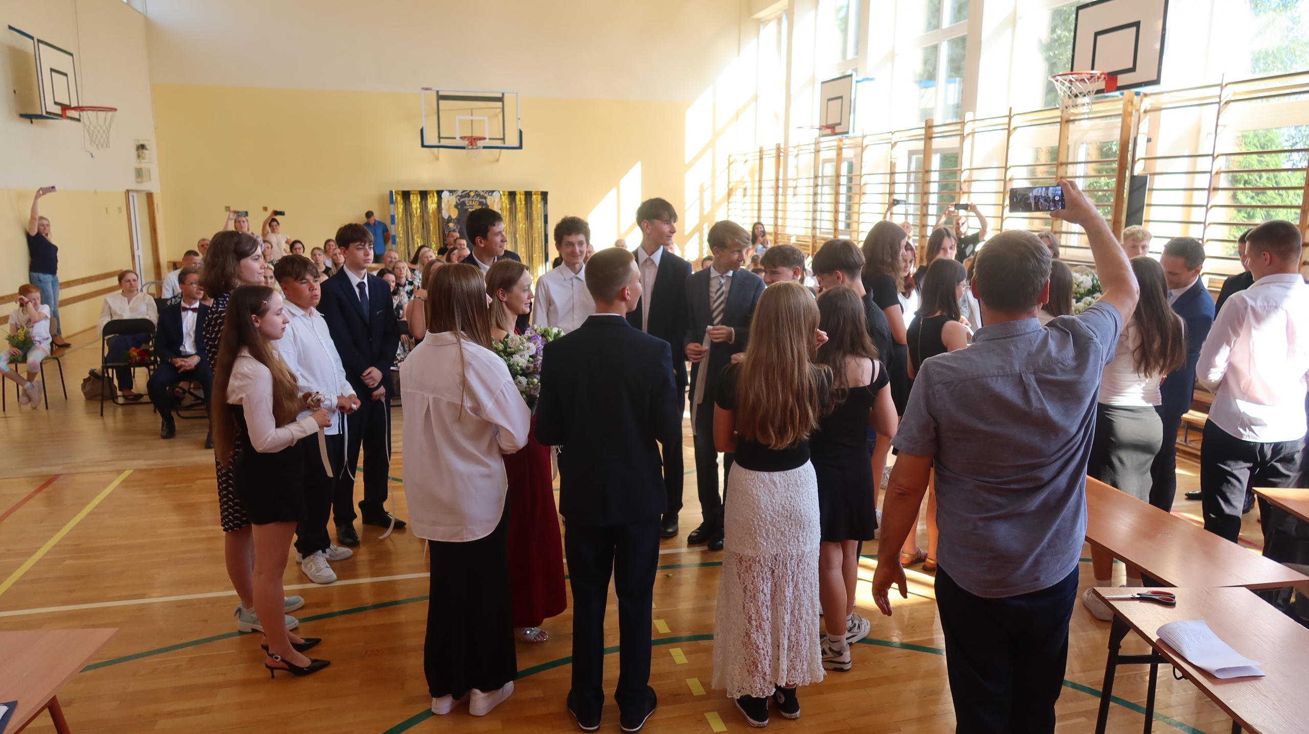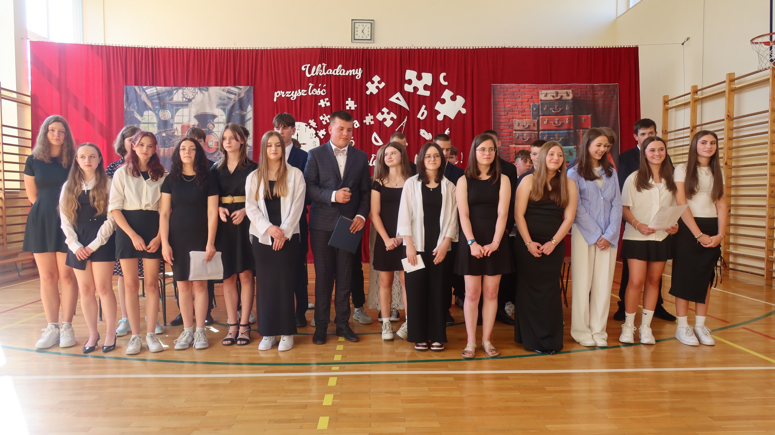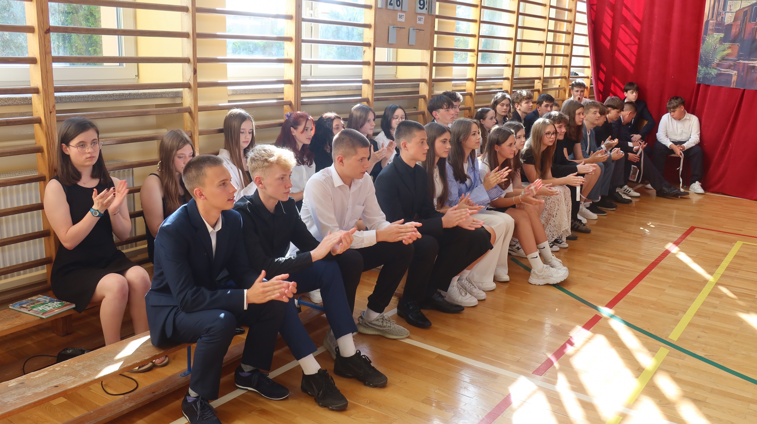 Szczególny charakter miało pożegnanie ze szkołą ósmoklasistów, które odbyło się dzień wcześniej. Przyszli absolwenci zaprezentowali program artystyczny, pełen humoru i wzruszających słów. Najpierw reprezentanci obu klas wystąpili w turnieju inspirowanym telewizyjną „Familiadą”, w którym padły pytania na tematy związane z codziennym życiem szkolnym. Spontaniczne odpowiedzi uczniów dostarczyły wszystkim zebranym w sali gimnastycznej członkom rady pedagogicznej oraz rodzicom wiele radości. Następnie ósmoklasiści odegrali scenkę kabaretową pod tytułem „Jak to przeżyliśmy?”, która w krzywym zwierciadle przedstawiła naszą szkolną rzeczywistość. Dopełnieniem całości były dwa grupowe występy wokalne. Miłą niespodzianką dla wychowawców obu klas były przygotowane przez uczniów wiersze, których tematem przewodnim były nauczane przez nich przedmioty. Koniec wspólnej drogi wyznaczył symboliczny gest – przecięcie przez wychowawców wstążek przy wiązankach kwiatów trzymanych przez uczniów. Całej uroczystości towarzyszyło wiele słów podziękowań dla dyrekcji, nauczycieli i rodziców za ich trud wychowawczy, a także życzeń płynących w stronę przyszłych absolwentów. Tego dnia szczególnie wyróżnieni zostali uczniowie, którzy zasłużyli się pracą na rzecz środowiska szkolnego, zostali laureatami konkursów lub osiągnęli wysokie wyniki w nauce. Otrzymali oni dyplomy, listy gratulacyjne i nagrody.