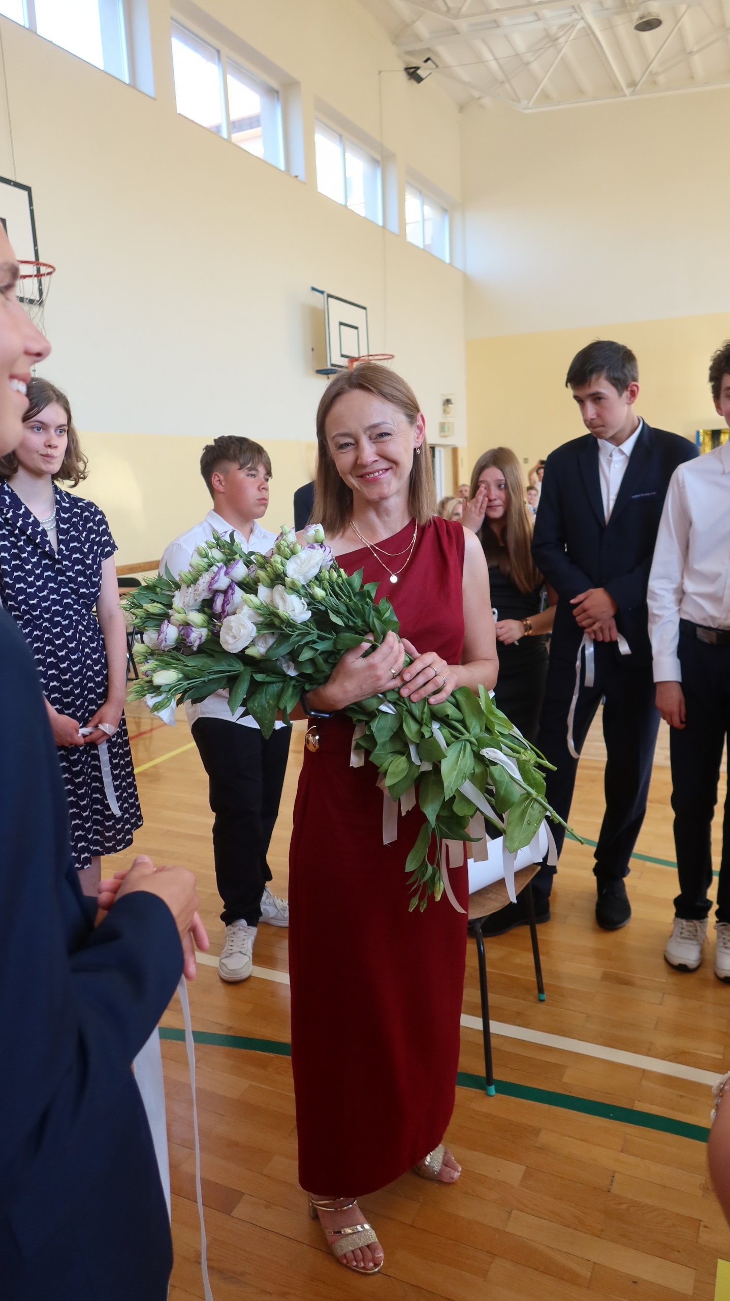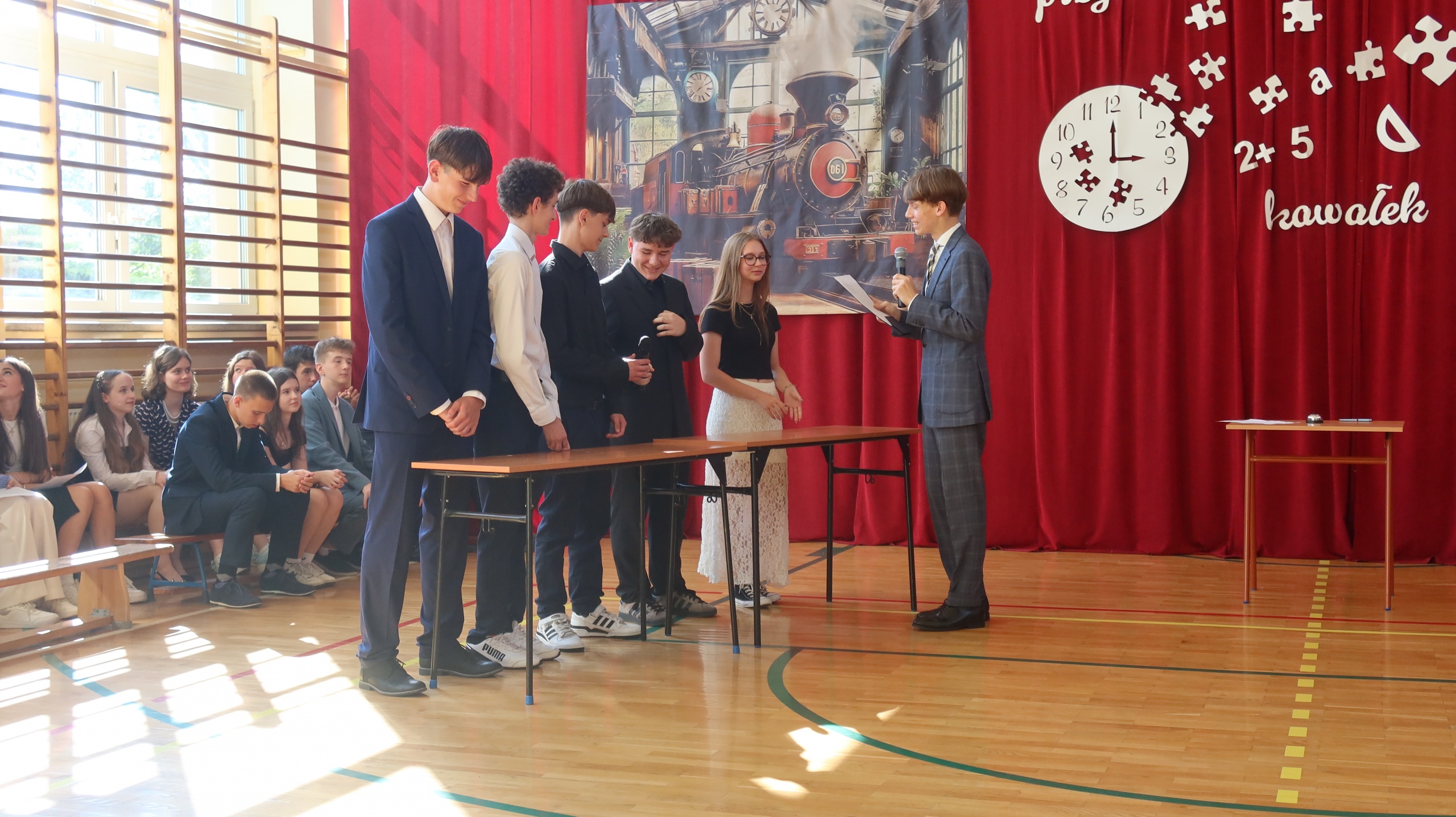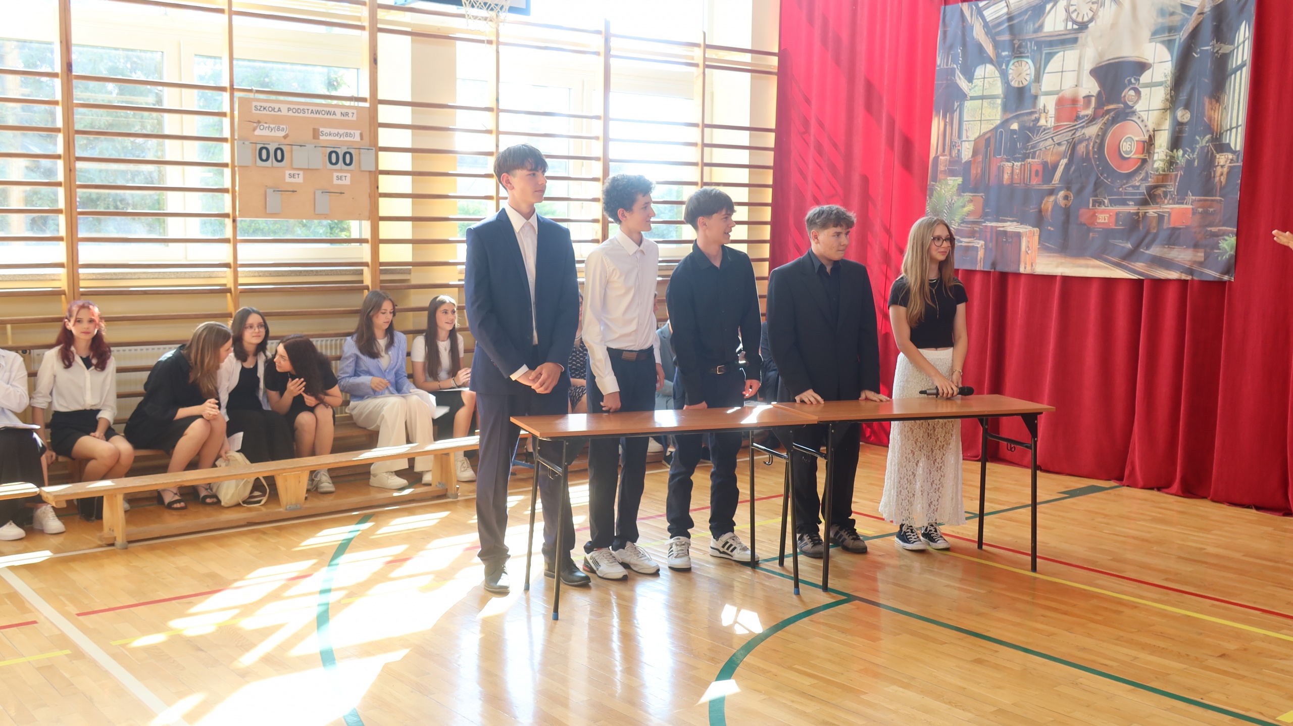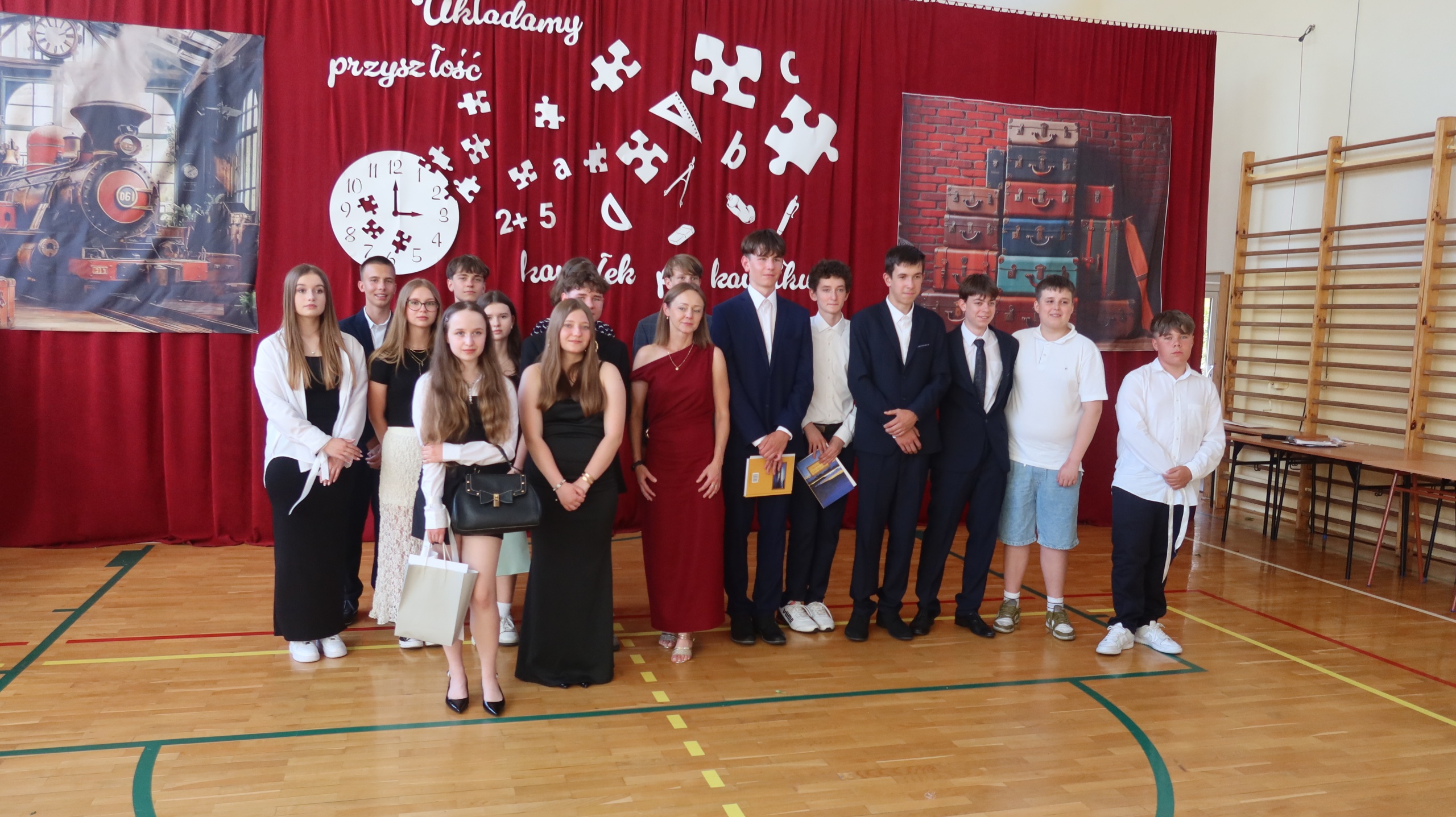 Szczególny charakter miało pożegnanie ze szkołą ósmoklasistów, które odbyło się dzień wcześniej. Przyszli absolwenci zaprezentowali program artystyczny, pełen humoru i wzruszających słów. Najpierw reprezentanci obu klas wystąpili w turnieju inspirowanym telewizyjną „Familiadą”, w którym padły pytania na tematy związane z codziennym życiem szkolnym. Spontaniczne odpowiedzi uczniów dostarczyły wszystkim zebranym w sali gimnastycznej członkom rady pedagogicznej oraz rodzicom wiele radości. Następnie ósmoklasiści odegrali scenkę kabaretową pod tytułem „Jak to przeżyliśmy?”, która w krzywym zwierciadle przedstawiła naszą szkolną rzeczywistość. Dopełnieniem całości były dwa grupowe występy wokalne. Miłą niespodzianką dla wychowawców obu klas były przygotowane przez uczniów wiersze, których tematem przewodnim były nauczane przez nich przedmioty. Koniec wspólnej drogi wyznaczył symboliczny gest – przecięcie przez wychowawców wstążek przy wiązankach kwiatów trzymanych przez uczniów. Całej uroczystości towarzyszyło wiele słów podziękowań dla dyrekcji, nauczycieli i rodziców za ich trud wychowawczy, a także życzeń płynących w stronę przyszłych absolwentów. Tego dnia szczególnie wyróżnieni zostali uczniowie, którzy zasłużyli się pracą na rzecz środowiska szkolnego, zostali laureatami konkursów lub osiągnęli wysokie wyniki w nauce. Otrzymali oni dyplomy, listy gratulacyjne i nagrody.