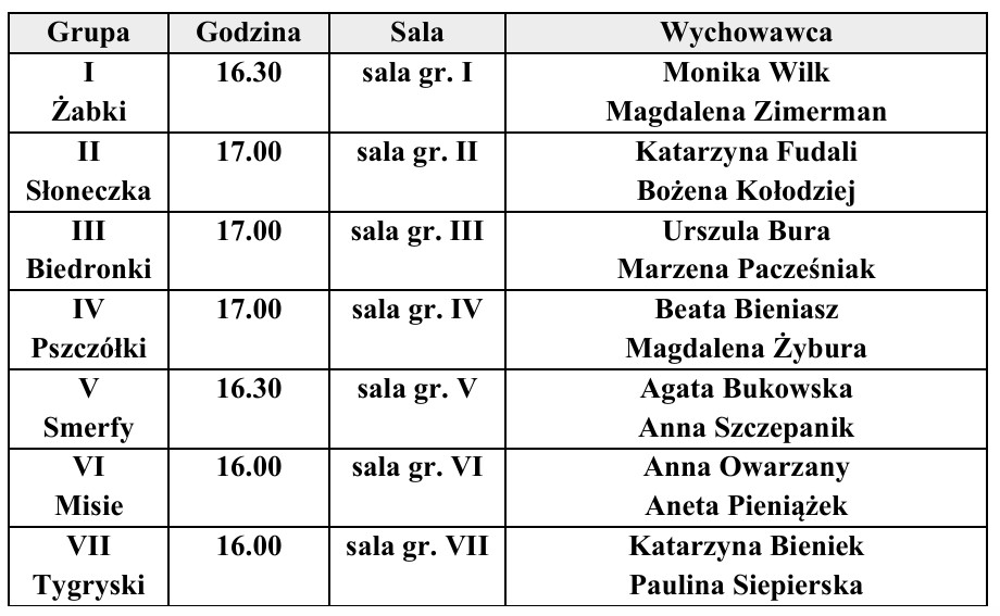 Uprzejmie informujemy, że spotkania wychowawców poszczególnych grup przedszkolnych z rodzicami odbędą się 17 września 2025 r. (środa) wg harmonogramu zamieszczonego poniżej: