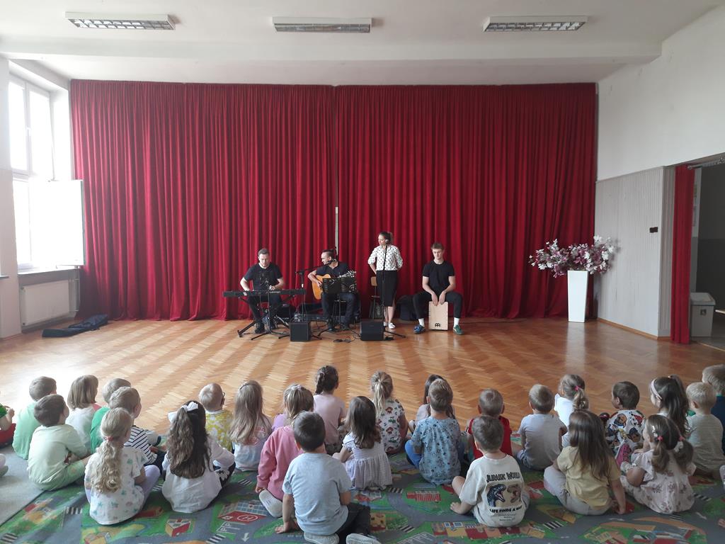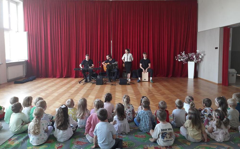 Dzieci przeniosły się w świat melodii i radosnych dźwięków, które towarzyszą zabawom na świeżym powietrzu. Podczas spotkania przedszkolaki poznały i wspólnie śpiewały znane piosenki, które rozbrzmiewają od lat. W czasie audycji zabrzmiała muzyka, która na pewno łączy pokolenia i pewnie budzi tęsknotę za czasami beztroski, spędzanymi przy osiedlowym trzepaku, a może i trochę za wakacjami, które już za nami….