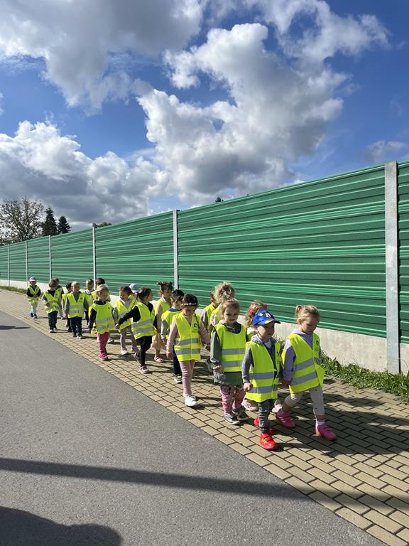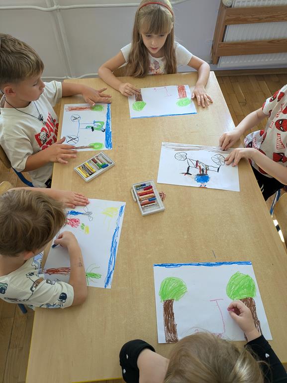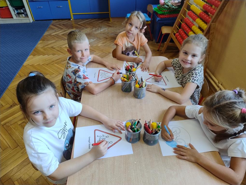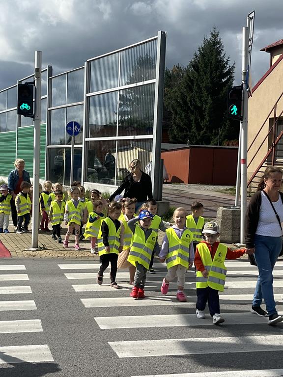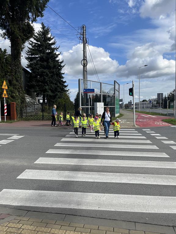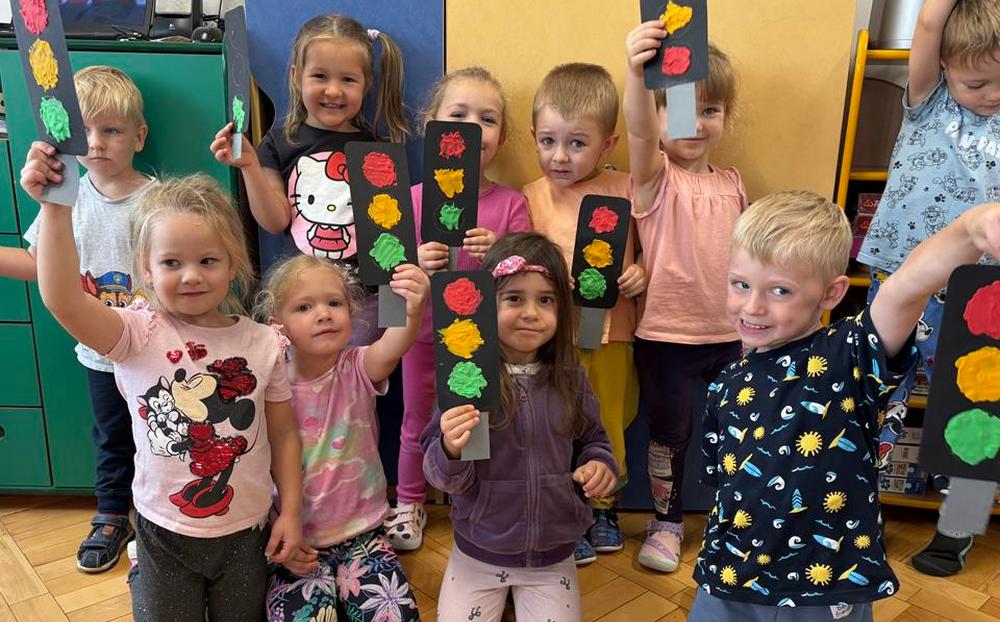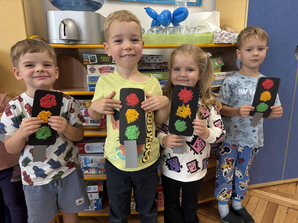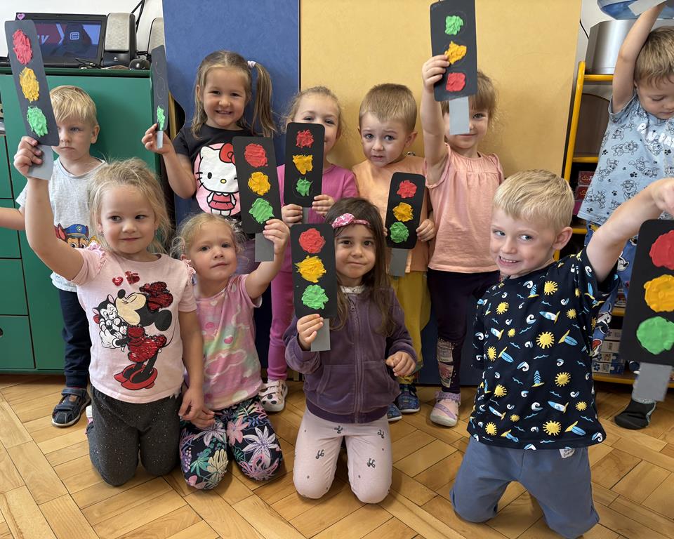 Wybraliśmy się na pobliskie skrzyżowanie, aby w praktyce poznać zasady bezpiecznego przechodzenia przez jezdnię, znaki drogowe i sygnalizację świetlną. Dzieci miały okazję obserwować ruch uliczny i uczyć się odpowiedzialnych zachowań jako piesi. W ramach zajęć plastycznych powstały niezwykłe prace pt. „Sygnalizatory”, „Rowerem lub hulajnogą przez świat” – przedszkolaki z ogromnym zaangażowaniem przedstawiały w nich swoje marzenia o podróżach oraz ulubione środki transportu. Odbyły się również zajęcia edukacyjne dotyczące bezpieczeństwa w ruchu drogowym – dzieci poznawały podstawowe zasady poruszania się po drogach, uczyły się znaczenia wybranych znaków drogowych oraz tego, jak dbać o swoje bezpieczeństwo jako piesi i mali rowerzyści. Przedszkolaki miały szansę sprawdzenia swojej wiedzy w praktyce (korzystając z Minimiasteczka Ruchu Drogowego), jak również swoich umiejętności w poruszaniu się rowerem i hulajnogą. Przed nami jeszcze spotkanie z policjantem, który opowie o swojej pracy oraz przypomni dzieciom, jak bezpiecznie poruszać się po drogach i dlaczego warto nosić elementy odblaskowe.