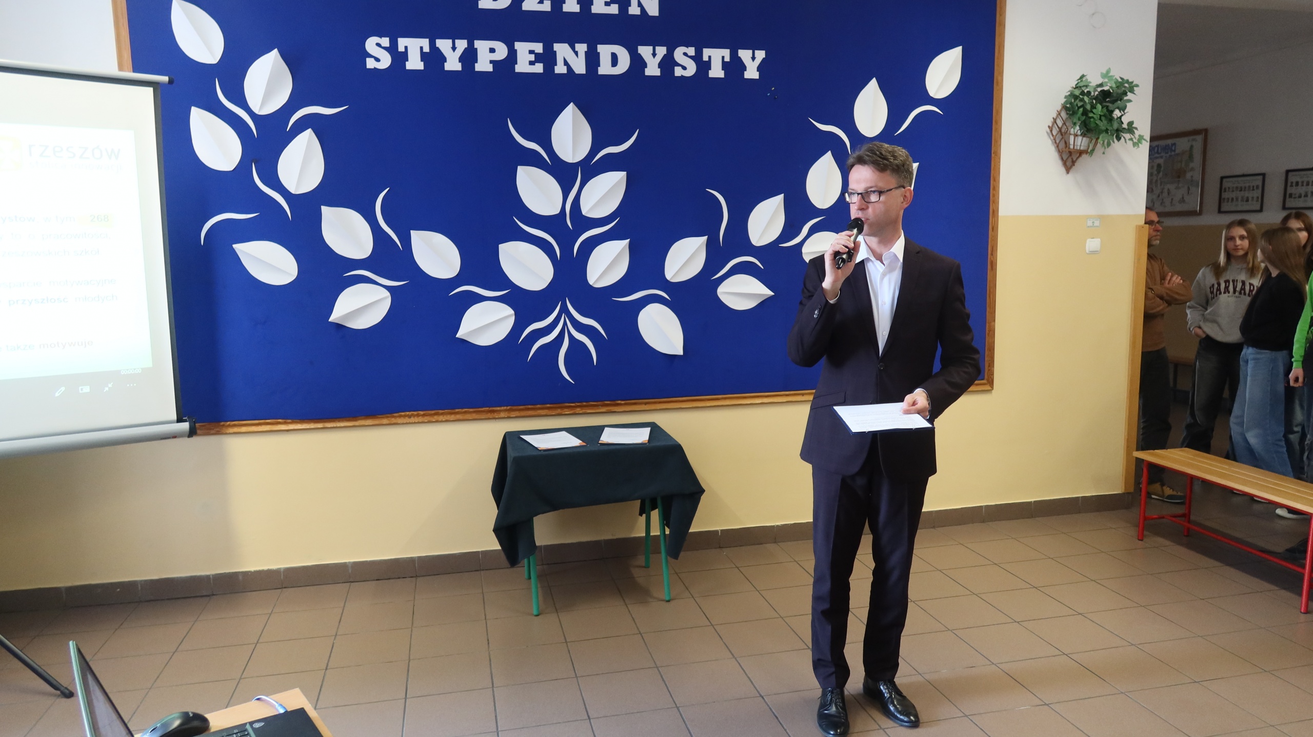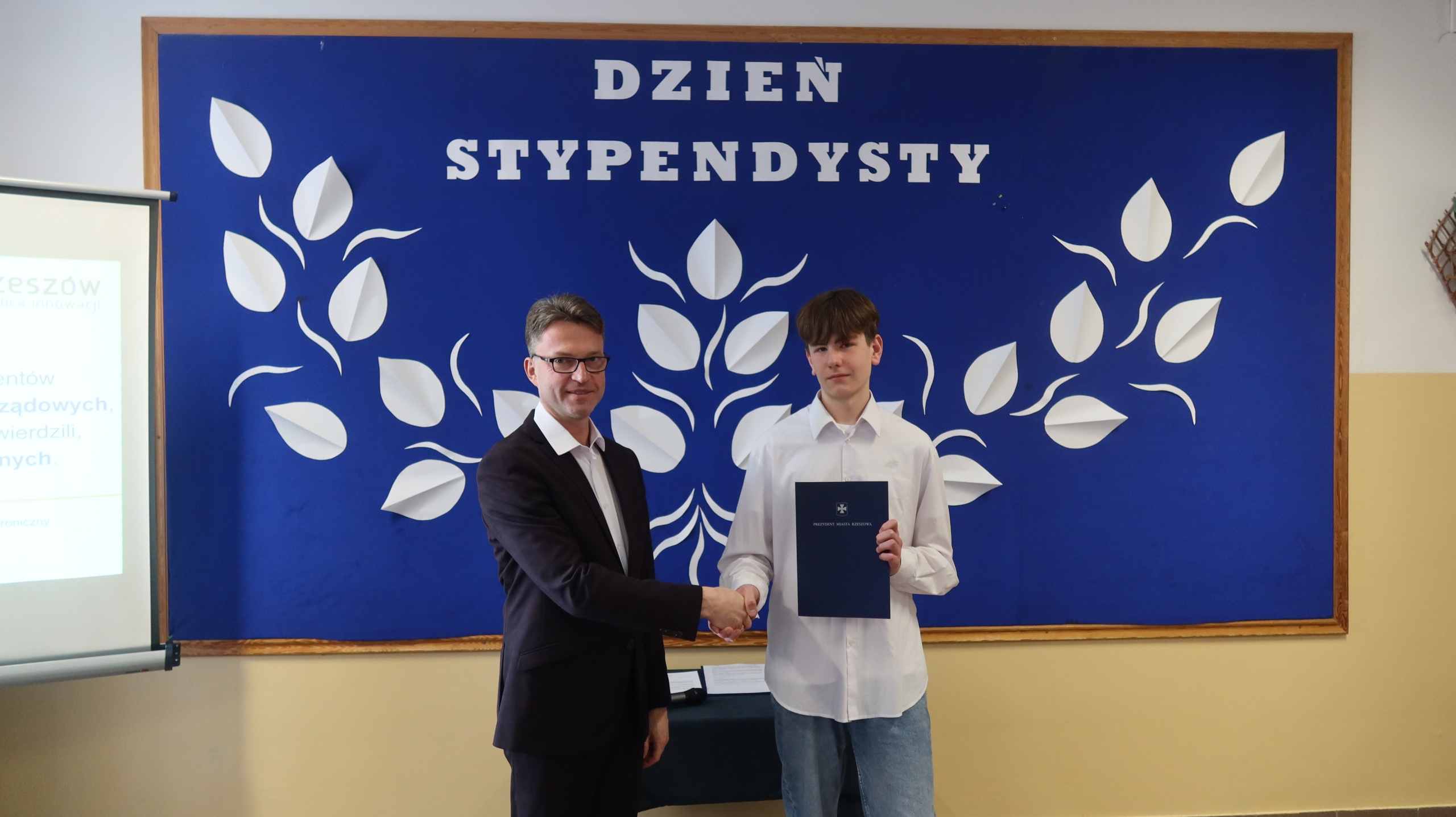 Najważniejszym punktem spotkania było jednak wyróżnienie Huberta Żurawskiego, naszego laureata Programu Stypendialnego w kategorii Mistrz. Hubert otrzymał gratulacje od Prezydenta Miasta Rzeszowa (za pośrednictwem listu), dyrekcji naszej szkoły oraz gromkie brawa od uczestników apelu. Wszyscy zgodnie podreślali, że stypendium to dowód docenienia wysokiej wiedzy i umiejętności Huberta, jego zaangażowania i wytrwałości, ale i wzór dla innych uczniów do podejmowania nowych wyzwań i rozwijania swoich talentów. Podziękowania popłynęły także w stronę nauczycieli, wspierających uczniów w osiąganiu sukcesów.